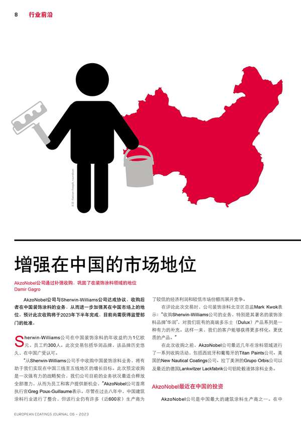 摘要:AkzoNobel公司通過補強收購,鞏固了在裝飾涂料領域的地位