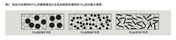 因此,當PVC為30%時,降低鈦白粉用量,配制白色液體油 墨,獲得總體不透明度最佳還是有可能的。該方法已成功應用于 高光/半光涂料,適當降低PVC含量,使用礦物填料優化鈦白粉含量和不透明性(舉例參見文獻[5-8])。據報道,與粗顆粒和塊狀顆 粒相比,具有層狀結構的細礦物顆粒(如高嶺土)更加有效,具 體效果見圖2所示,這種層狀顆??筛纳撇煌该鞫鹊脑蛟谟赥iO2 聚集體[9]較少,TiO2顆粒的吸收和粗糙效果[8]和TiO2顆粒可能被間 隔,不過文獻中對所述效果仍存在不同觀點[10]。因此,本研究重 點是使用超細高嶺土優化高TiO2含量的水性柔版印刷油墨配方,旨 在保持光澤和不透明度不變。