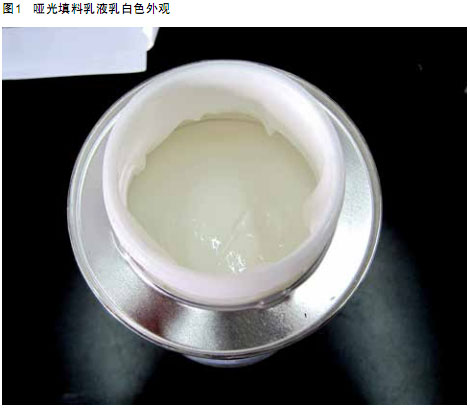 這種消光填料的物理性質見表1。 100%固體分的輻射固化基料不含溶劑,不含單體(活性稀釋劑),25°C時,黏度約為3 500 mPa·s,并呈現牛頓型特性。盡管外觀是乳白色的(圖1),但是在完全固化后則是透明的。
