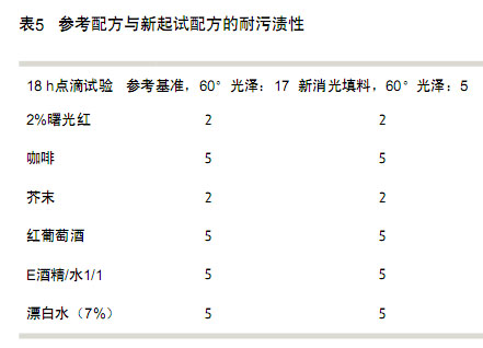 因此,對于參照配方和新起試配方的所有涂料,對其耐性進行18 h的點滴試驗。將每一種涂料以25 μm的濕膜厚度涂覆到白色Leneta紙上,并且使用兩個80 W Hg 燈,以10 m/min速度進行固化。如表5中所示,這兩種涂料的耐性相同,但是,含消光填料的涂料無光澤,而參照涂料的光澤要高出3倍以上。