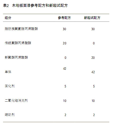 以下實例為專門用于木質和紙質基材的涂料。參照配方和新起試配方如表2所示。
