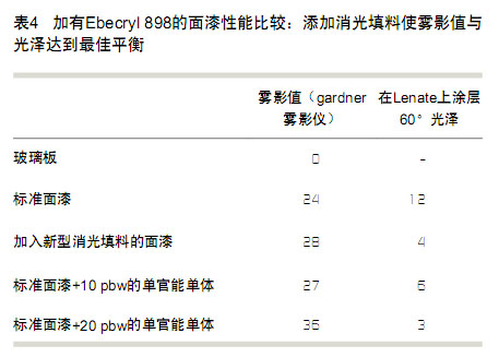 在玻璃上采用消光填料配制的涂料的霧影值略高于標準面漆的霧影值(28/ 24)。當涂覆在Leneta紙上時,光澤降低了3倍(4/12)。此外,對于標準配方,通過添加20 pbw的單官能單體而達到相同光澤度時,其霧影值上升到36。顯然,新型消光填料能夠配制出超低光澤涂料,透明度與傳統100%輻射固化系統(具有較高光澤)的透明度相似。