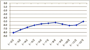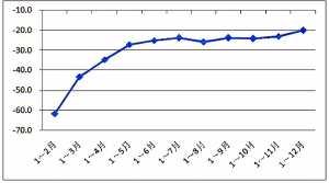 2015年石油和化工行業(yè)利潤月度累計(jì)變化情況 (單位:%)