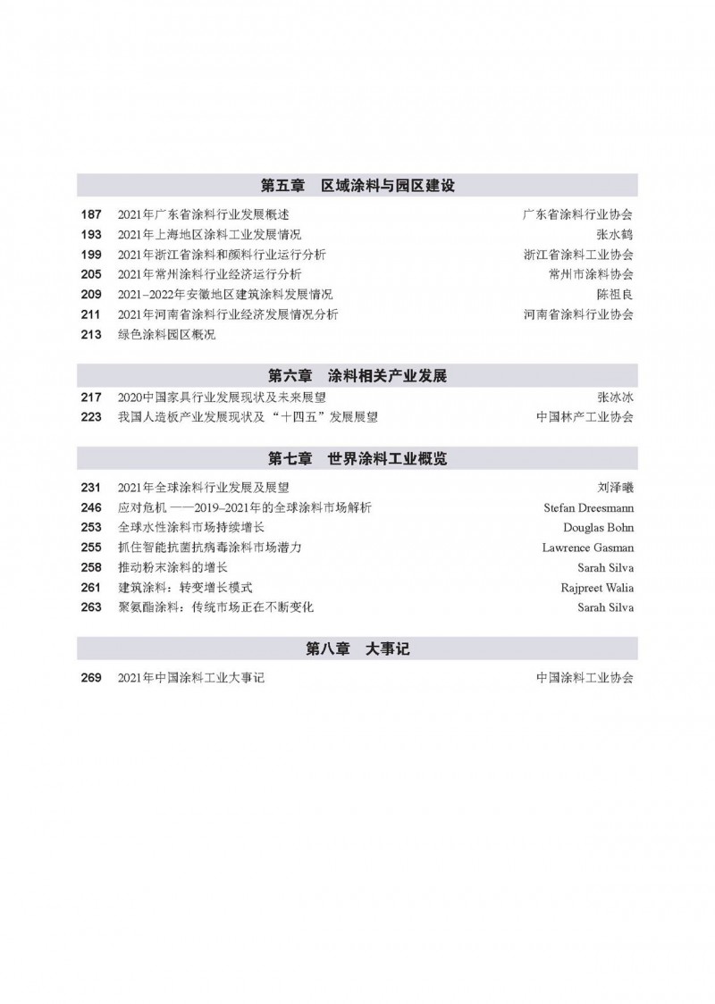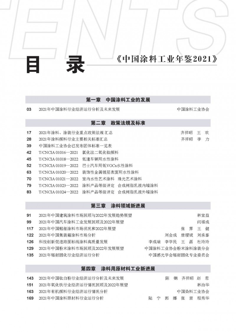 《中國涂料工業年鑒2021》共分7個章節,總結了2021年中國涂料工業經濟運行現狀,收錄了2021年度與涂料和顏料行業相關的政策法規及標準,闡述了我國涂料細分領域2021年度經濟運行、市場狀況、技術新進展及未來發展,整理了國內主要地區的涂料工業運行及園區建設現狀,以及全球不同涂料領域市場發展狀況,總結了我國主要涂料用原材料工業的新進展和市場走勢,記錄了2021年我國涂料行業經歷的重要事件等。