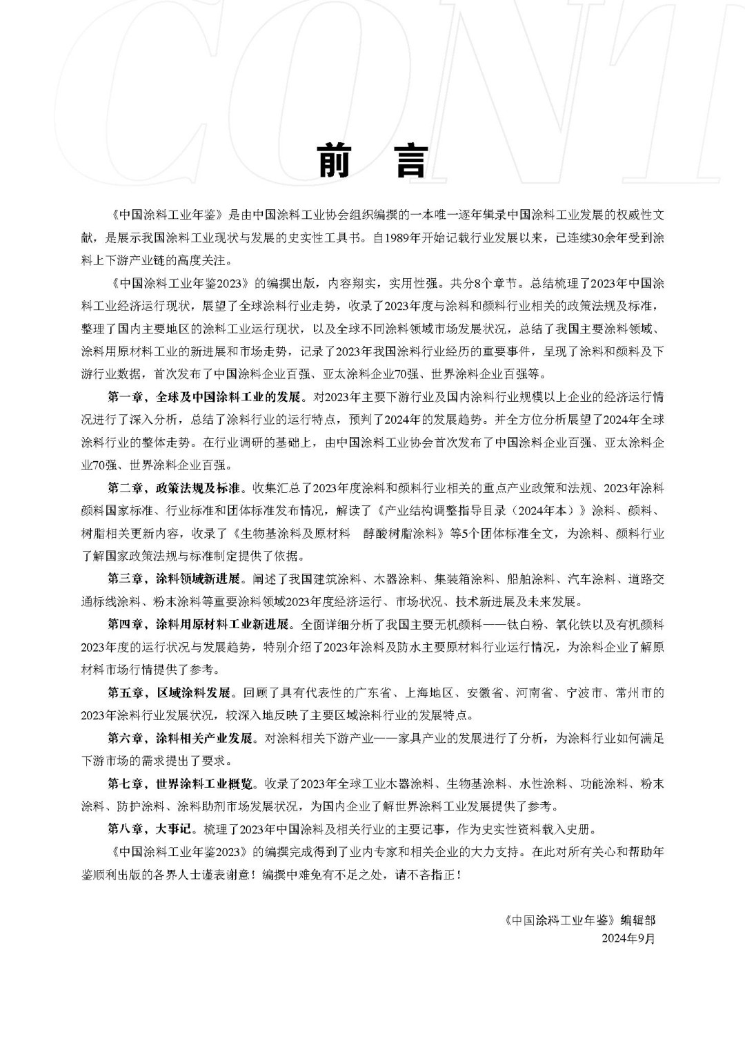 《中國涂料工業年鑒2023》的編撰完成得到了業內專家和相關企業的大力支持。在此對所有關心和幫助年鑒順利出版的各界人士謹表謝意!編撰中難免有不足之處,請不吝指正!