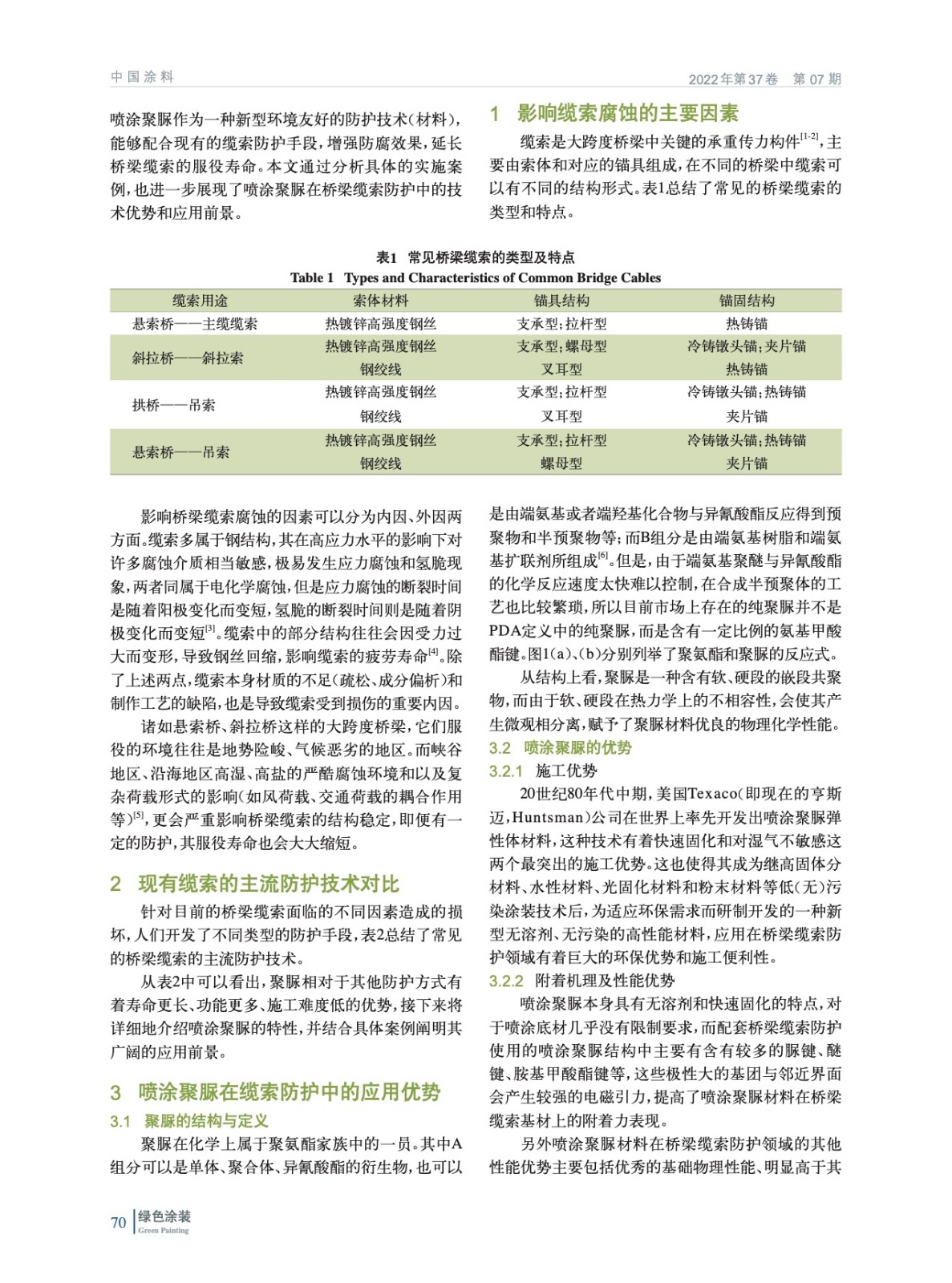 摘要:從橋梁纜索的分類和結(jié)構(gòu)特點(diǎn)入手,分析了損傷橋梁纜索的主要因素,列舉了常見(jiàn)的針對(duì)橋梁纜索的防護(hù)手段,進(jìn)而引出了一種新型環(huán)保的防護(hù)手段(材料)——噴涂聚脲,并對(duì)其應(yīng)用優(yōu)勢(shì)進(jìn)行了相關(guān)說(shuō)明。并結(jié)合實(shí)施案例闡述了噴涂聚脲在相關(guān)領(lǐng)域的具體使用方法以及優(yōu)良的防護(hù)性能。