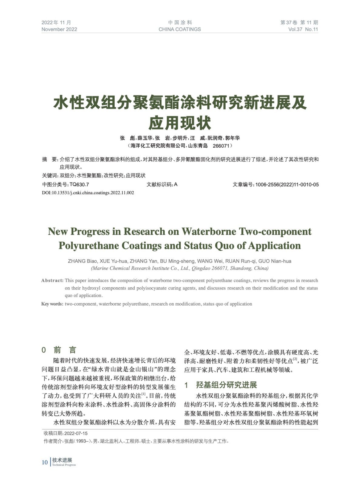 水性雙組分聚氨酯涂料研究新進展及應用現狀