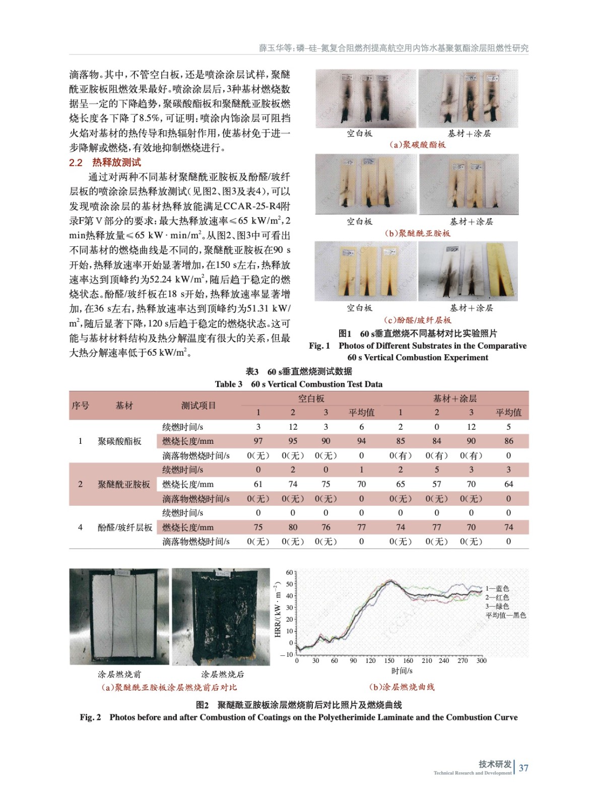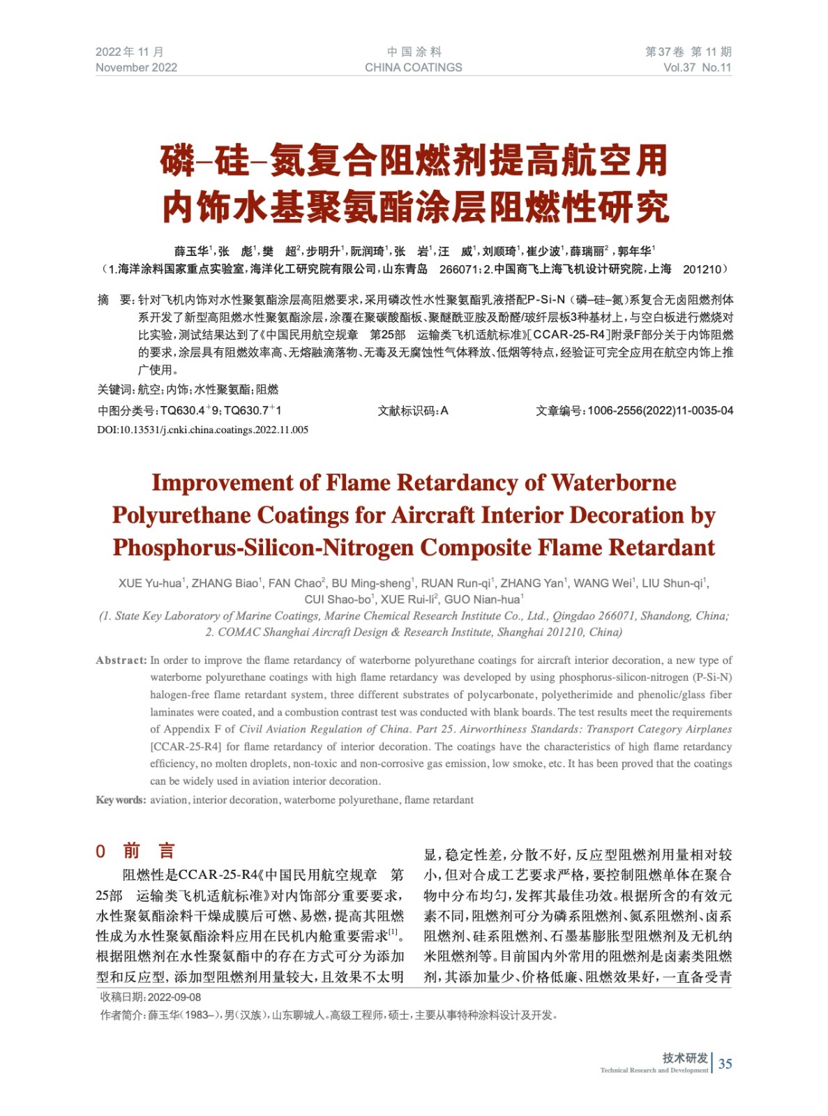 摘要:針對飛機內飾對水性聚氨酯涂層高阻燃要求,采用磷改性水性聚氨酯乳液搭配P-Si-N(磷–硅–氮)系復合無鹵阻燃劑體系開發了新型高阻燃水性聚氨酯涂層,涂覆在聚碳酸酯板、聚醚酰亞胺及酚醛/玻纖層板3種基材上,與空白板進行燃燒對比實驗,測試結果達到了《中國民用航空規章 第25部 運輸類飛機適航標準》[CCAR-25-R4]附錄F部分關于內飾阻燃的要求,涂層具有阻燃效率高、無熔融滴落物、無毒及無腐蝕性氣體釋放、低煙等特點,經驗證可完全應用在航空內飾上推廣使用。