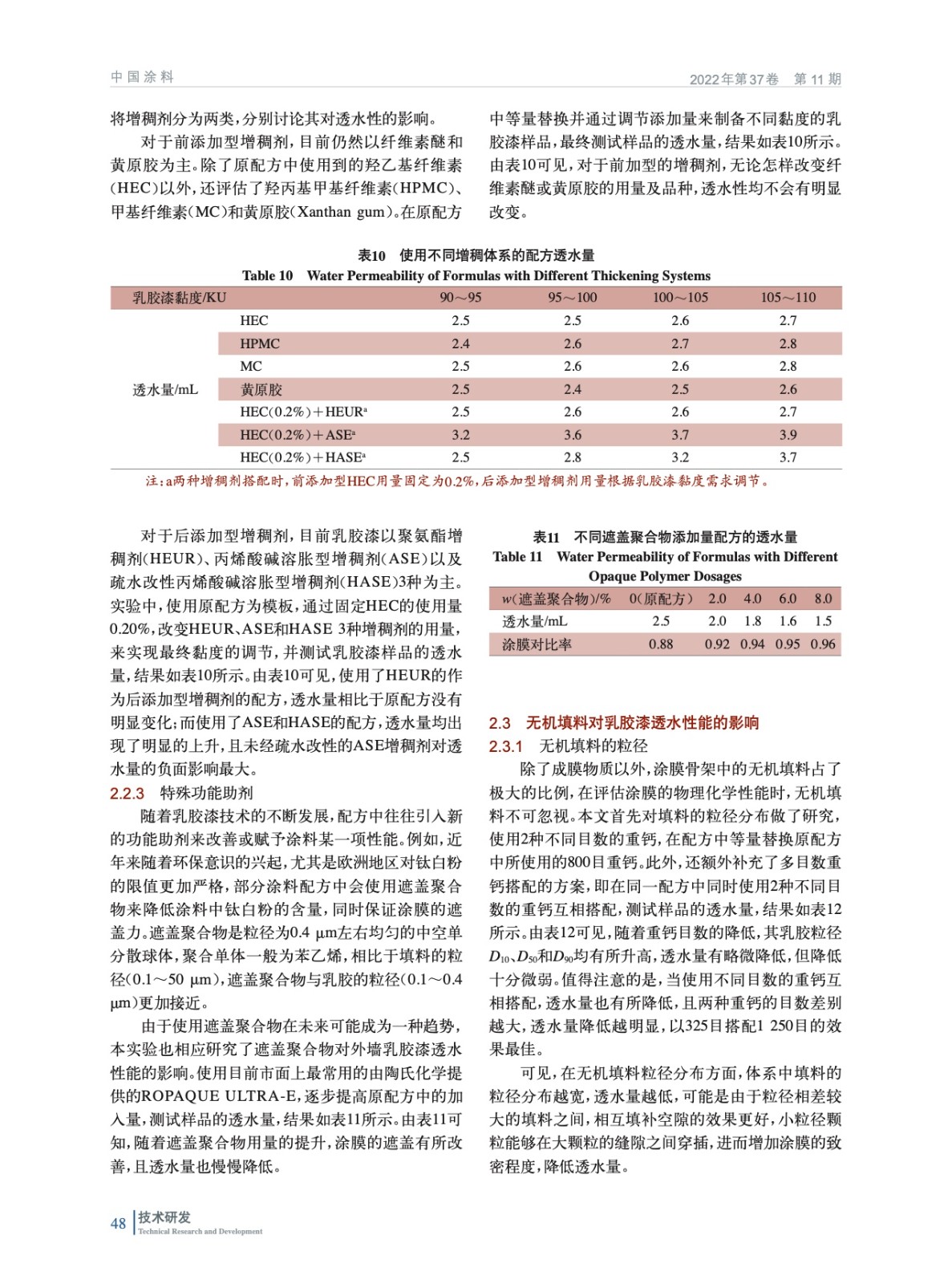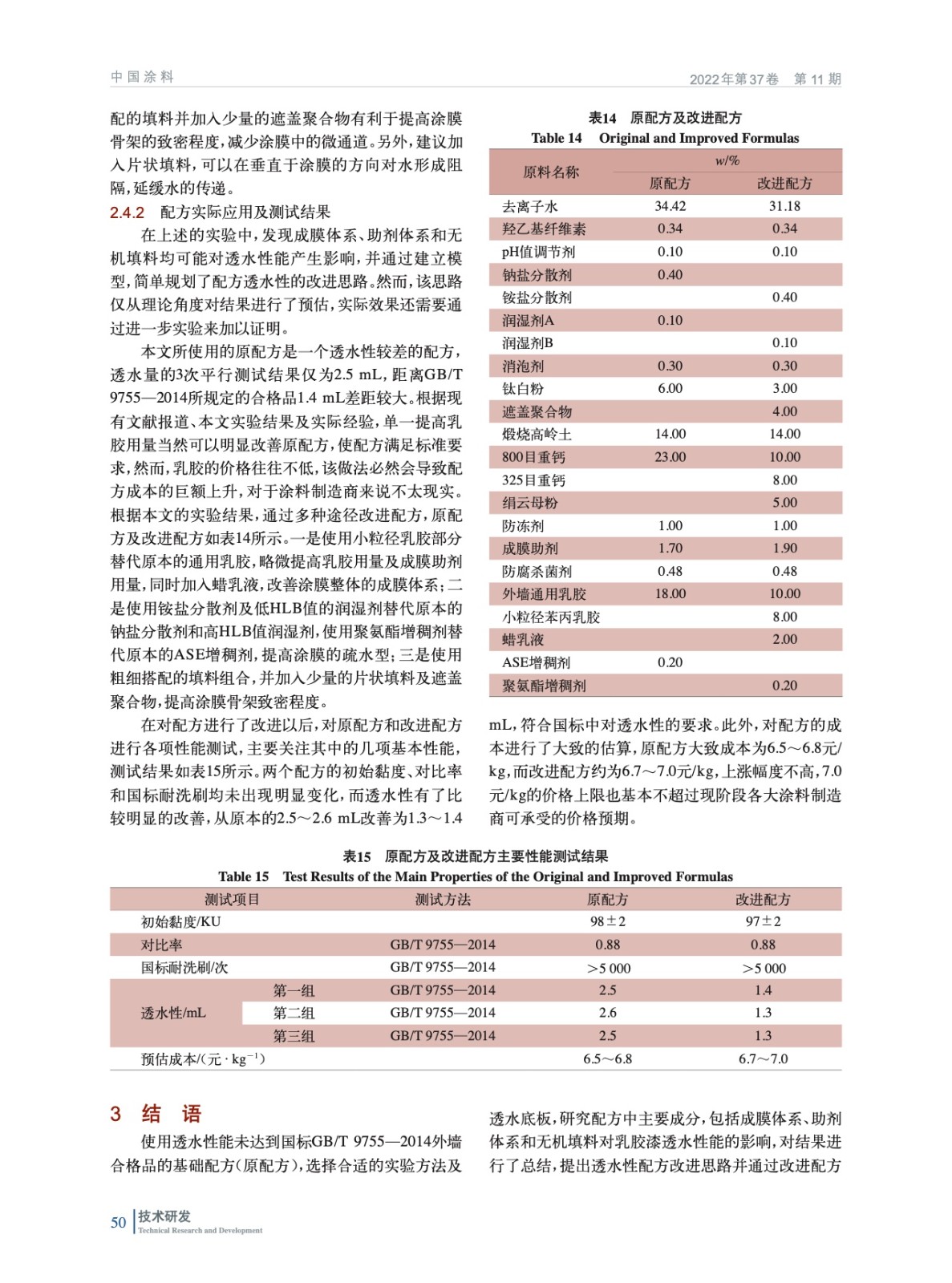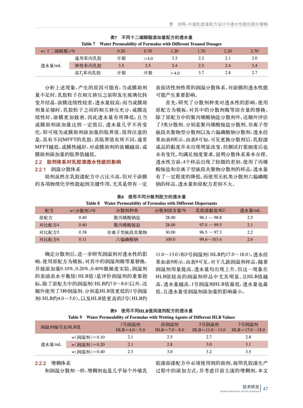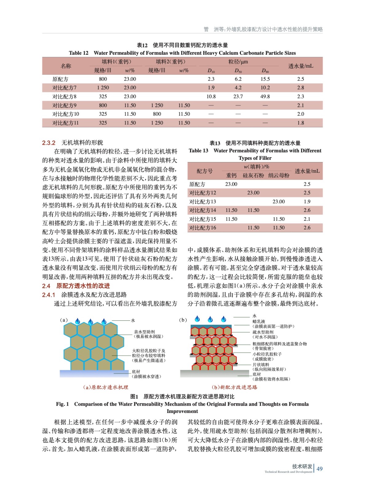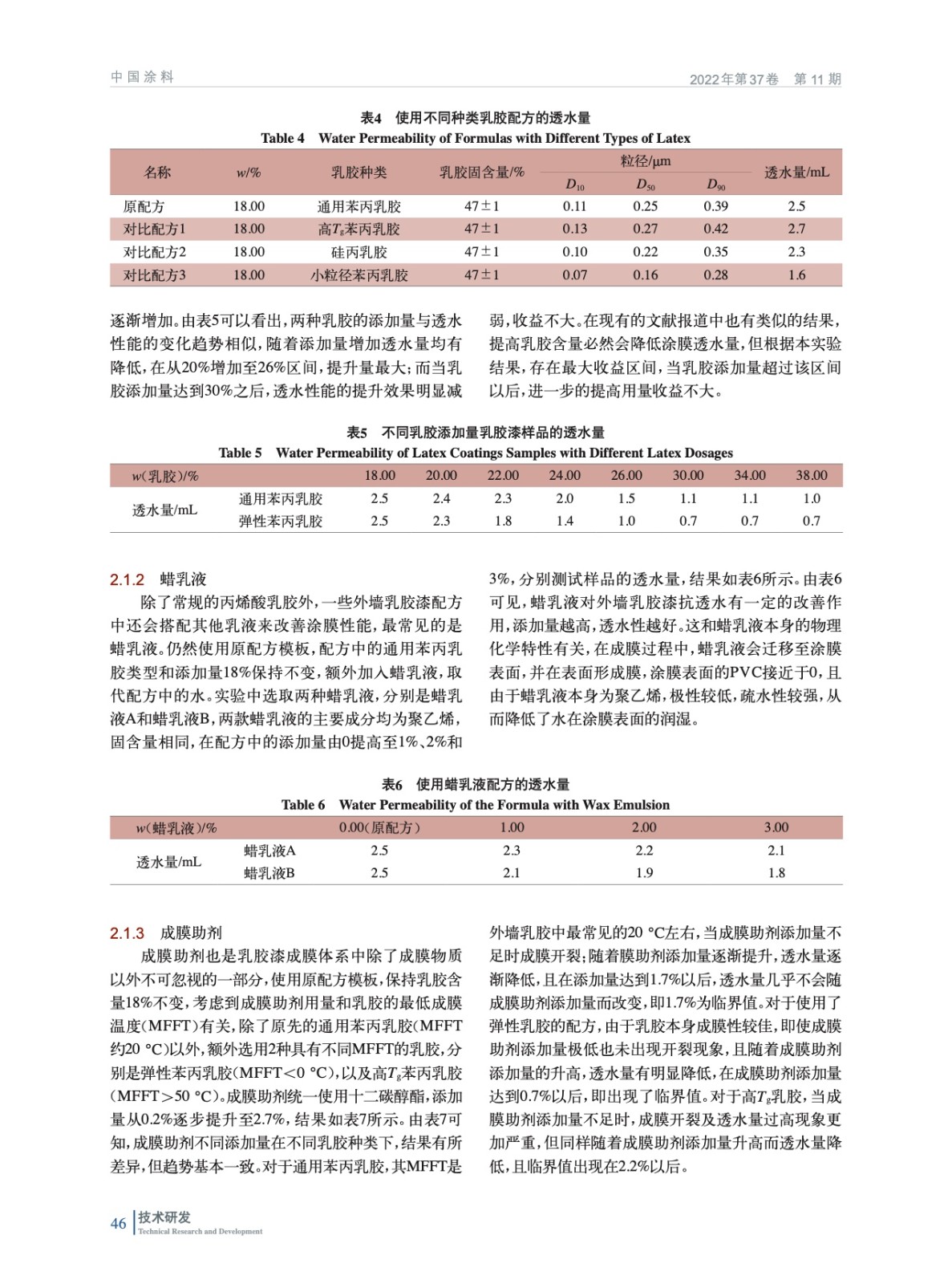 摘要:研究了成膜體系、助劑體系和無機(jī)填料對(duì)乳膠漆透水性能的影響。結(jié)果表明:成膜體系方面,使用小粒徑乳膠,提高乳膠用量并搭配少量的蠟乳液、提高成膜助劑用量可有助于改善涂層的成膜效果,進(jìn)而改善透水性;助劑方面,使用銨鹽分散劑替代鈉鹽分散劑、使用更低HLB值的潤(rùn)濕劑、使用疏水改性聚氨酯增稠劑替代堿溶脹增稠劑,并加入少量的遮蓋聚合物,均有助于改善透水性;無機(jī)填料方面,使用粗細(xì)搭配的填料體系,并盡可能使用片狀填料,也可一定程度改善透水性。根據(jù)實(shí)驗(yàn)結(jié)論和總結(jié)的涂膜透水及改進(jìn)模型,可為乳膠漆透水性能的提升給出配方優(yōu)化建議,并驗(yàn)證了改良后的配方能夠有效降低涂膜的透水量,使其達(dá)到外墻面漆合格品的指標(biāo),可為低成本、低透水的外墻乳膠漆配方設(shè)計(jì)提供思路。