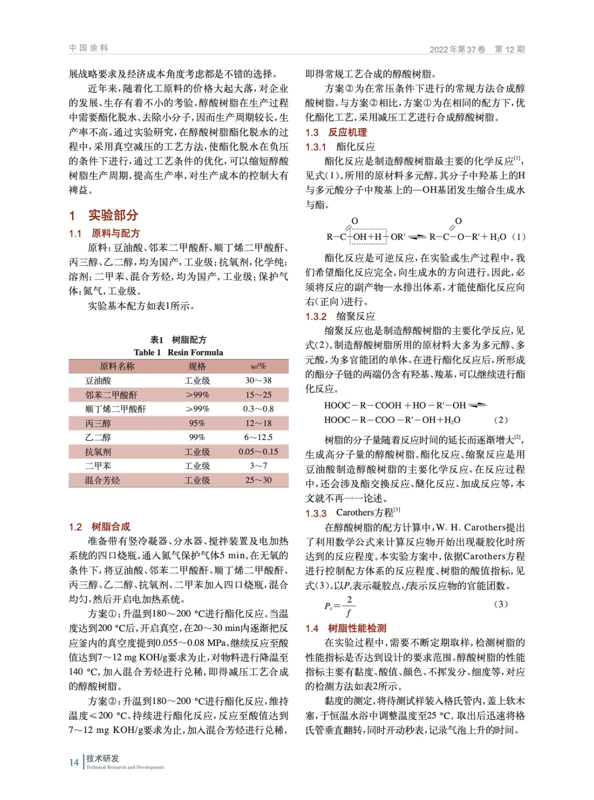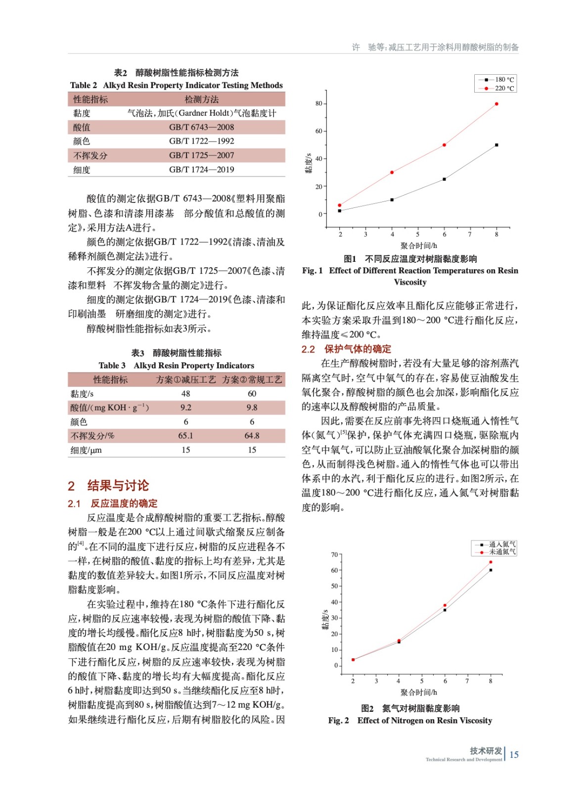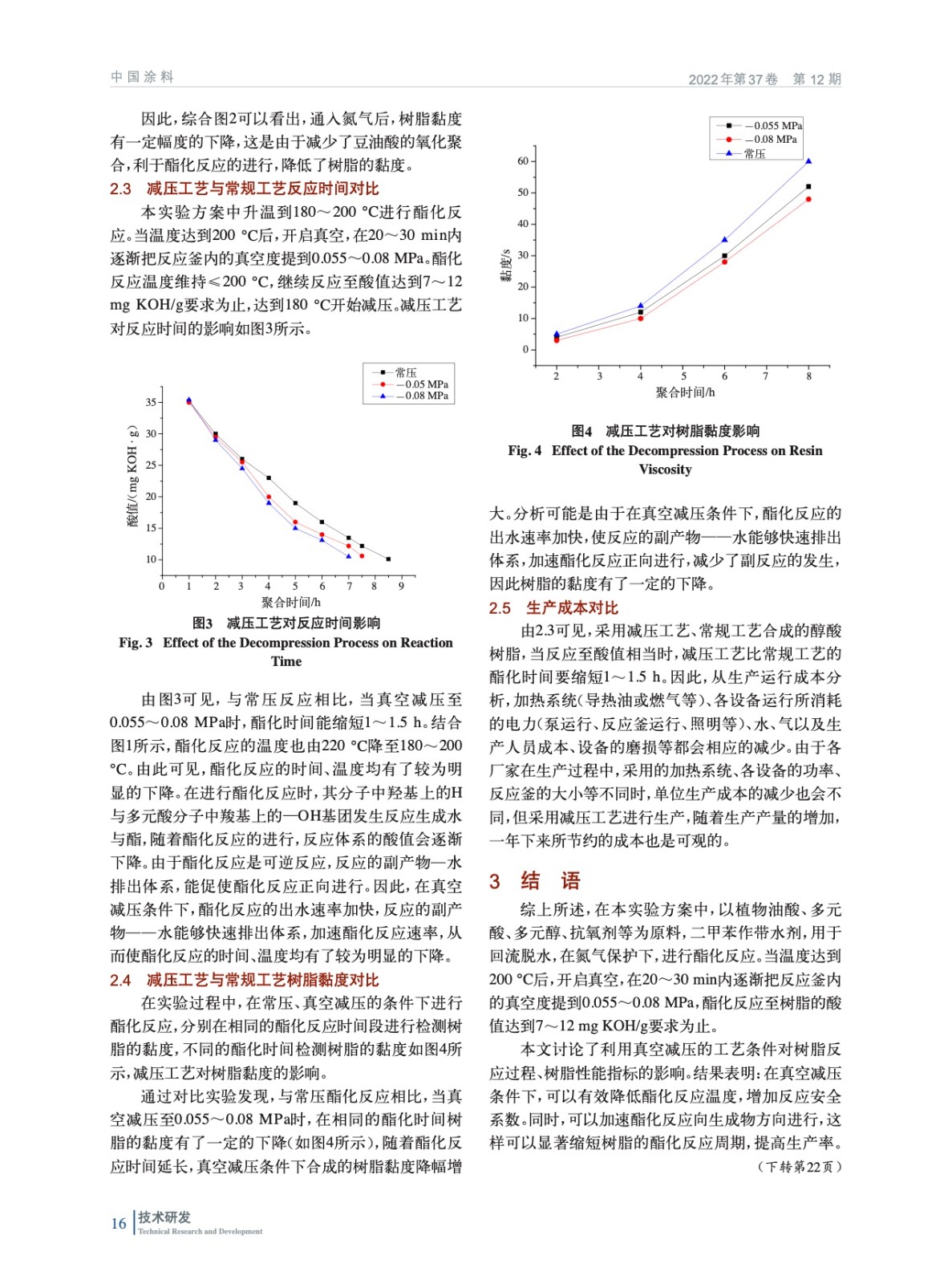 摘要:以植物油酸、多元酸、多元醇、抗氧劑等為原料,二甲苯作帶水劑,用于回流脫水,在氮氣保護下,進行酯化反應。當溫度達到200 ℃后,開啟真空,在20~30 min內逐漸把反應釜內的真空度提到0.055~0.08 MPa,反應至酸值達到7~12 mg KOH/g要求為止。討論了利用真空減壓的工藝條件對樹脂反應過程、樹脂性能指標的影響。結果表明:抽真空減壓,可以有效地降低了反應溫度,增加了反應安全系數。同時,可以加速反應向生成物方向進行,這樣可以顯著縮短樹脂的酯化反應周期,提高生產率。