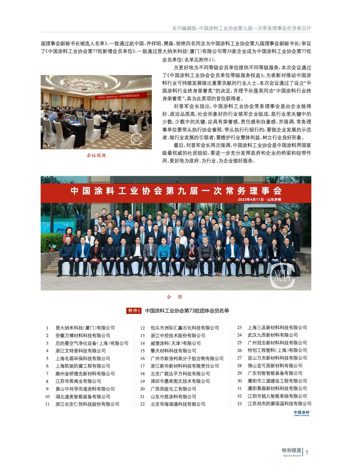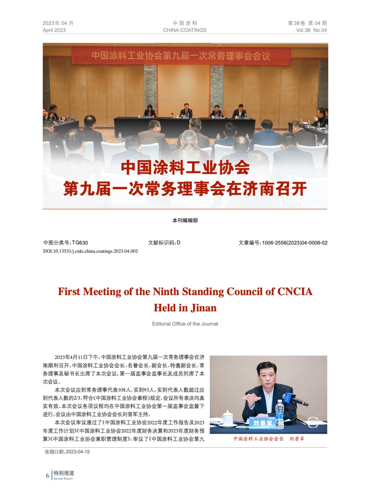 2023年4月11日下午,中國涂料工業協會第九屆一次常務理事會在濟南順利召開。中國涂料工業協會會長、名譽會長、副會長、特邀副會長、常務理事及秘書長出席了本次會議;第一屆監事會監事長及成員列席了本次會議。
