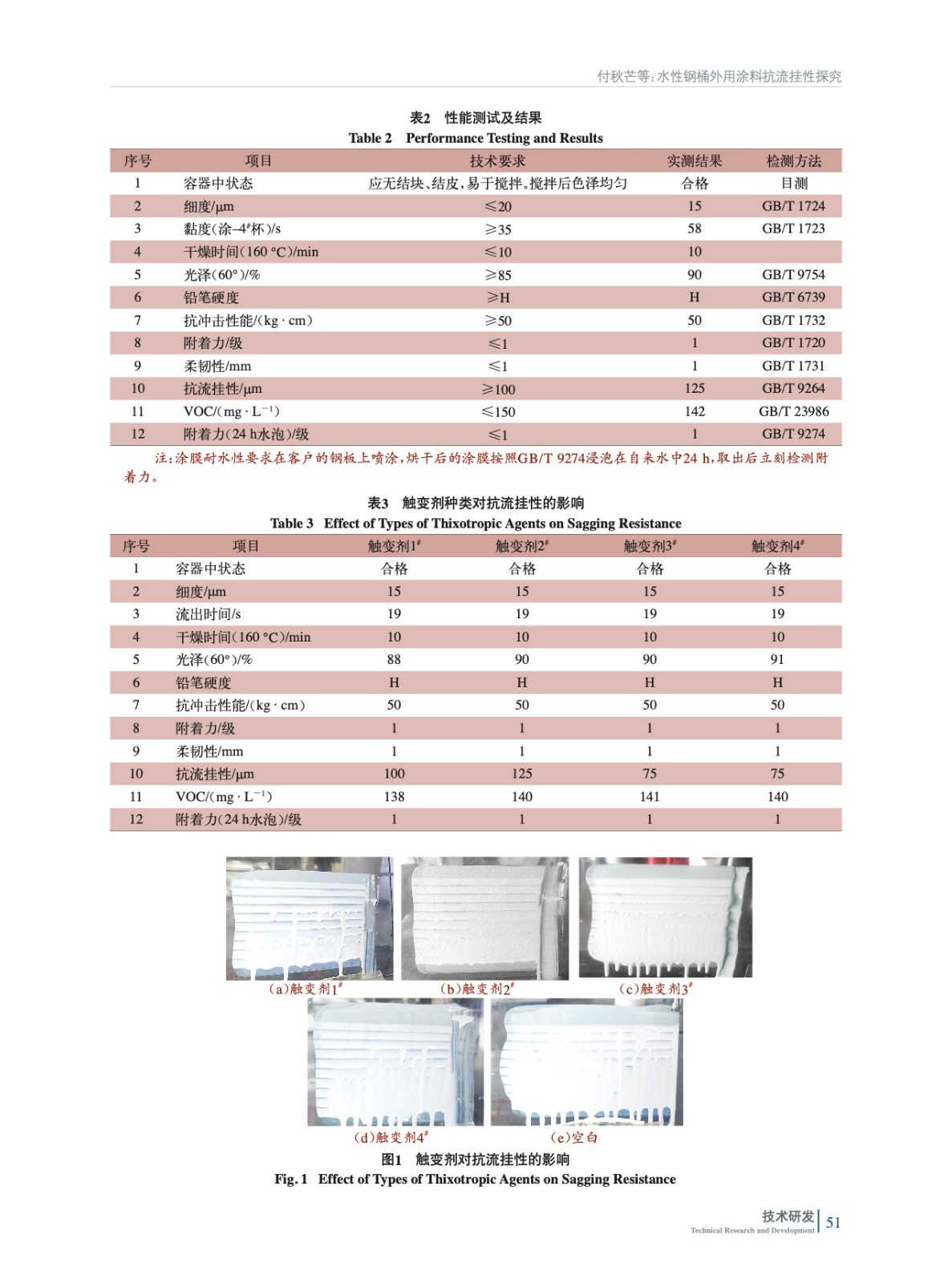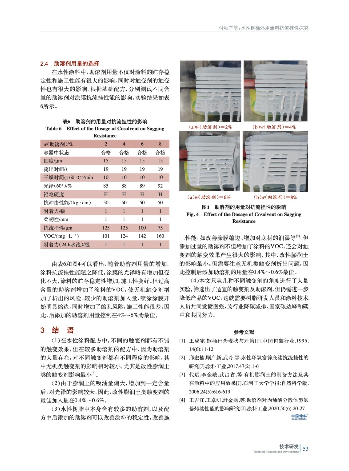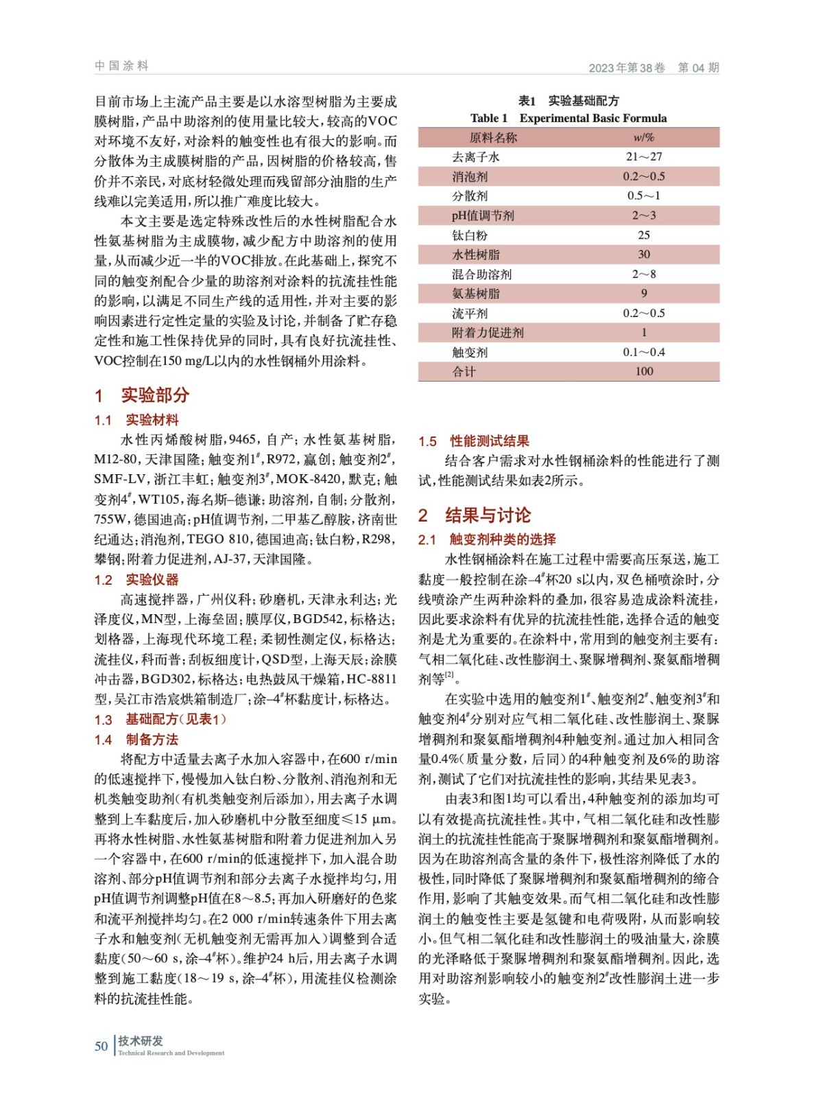 摘要:以水性樹脂和水性氨基樹脂為主要成膜物,搭配觸變劑并通過控制體系的pH值,制備了抗流掛性能良好的水性鋼桶用涂料。考察了觸變劑種類和用量以及不同含量的助溶劑對水性鋼桶用涂料抗流掛性能的影響。結果表明:在水性樹脂和水性氨基樹脂作為成膜物時,搭配改性膨潤土類的觸變劑,控制后添加助溶劑的質量分數在8%~12%時,涂膜的抗流掛性能達到100 μm以上。
