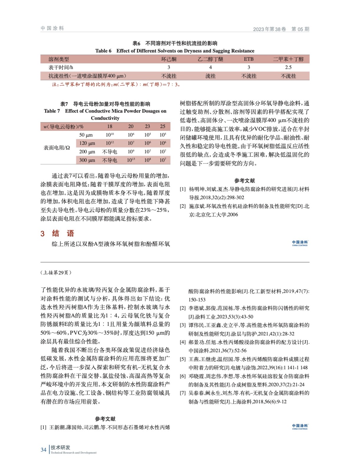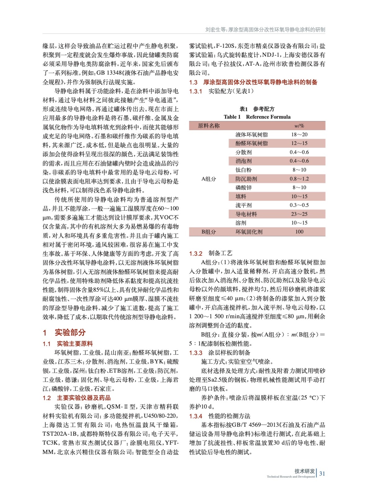 摘要:以液體雙酚A環氧樹脂和液體酚醛環氧樹脂為基料,以環境友好型稀釋劑為溶劑,在功能性導電材料、顏填料和助劑的配合下制備成厚涂型高固體分改性環氧導靜電涂料,并對涂膜的性能進行檢測。結果表明,采用噴涂施工時,一次性厚涂濕膜400 μm不流掛;實干后,表面電阻率可達到106~108 Ω;且涂膜具有優良的耐油性、耐鹽霧性、耐化學品性;經耐性測試后,其導電性衰減量很小。