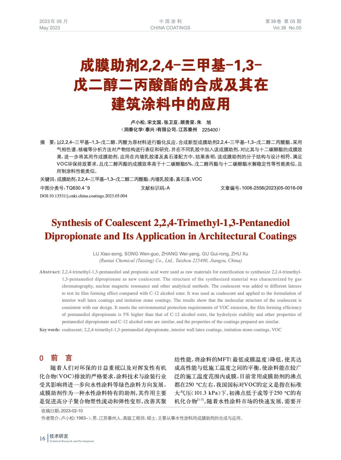 成膜助劑2,2,4–三甲基–1,3–戊二醇二丙酸酯的合成及其在建筑涂料中的應用