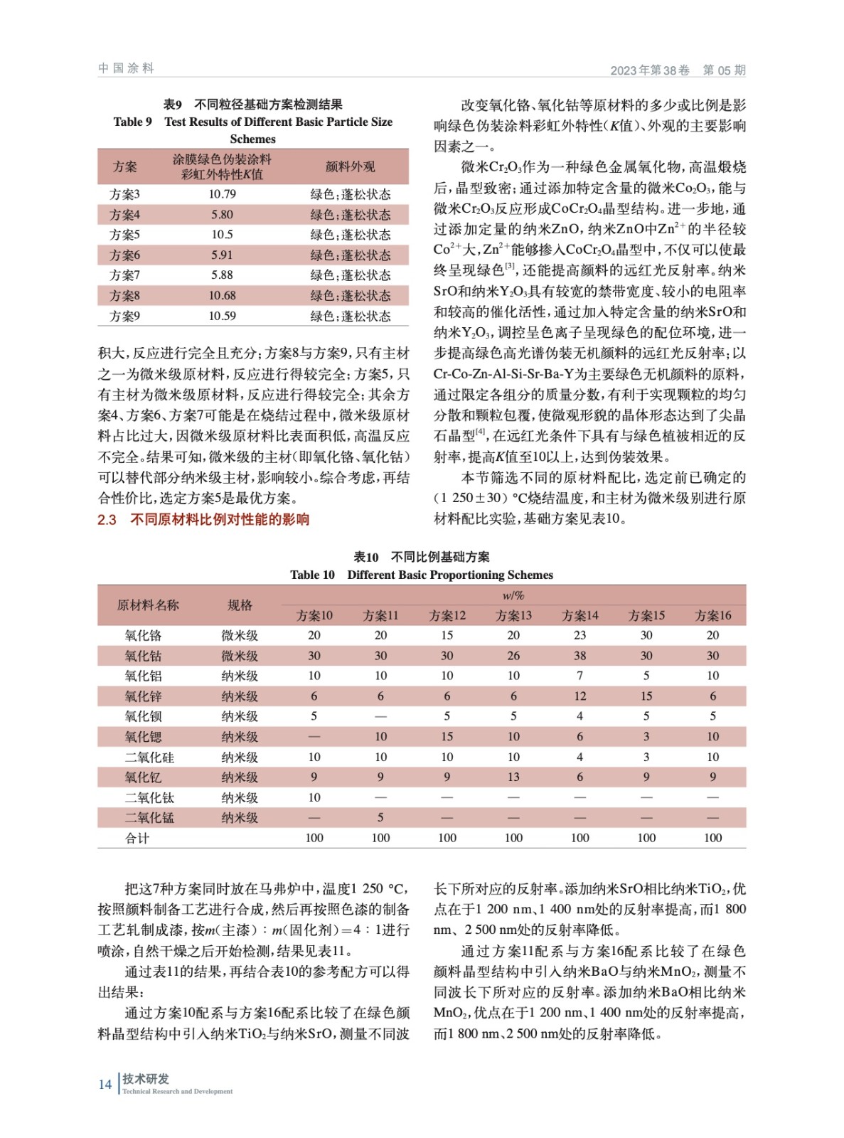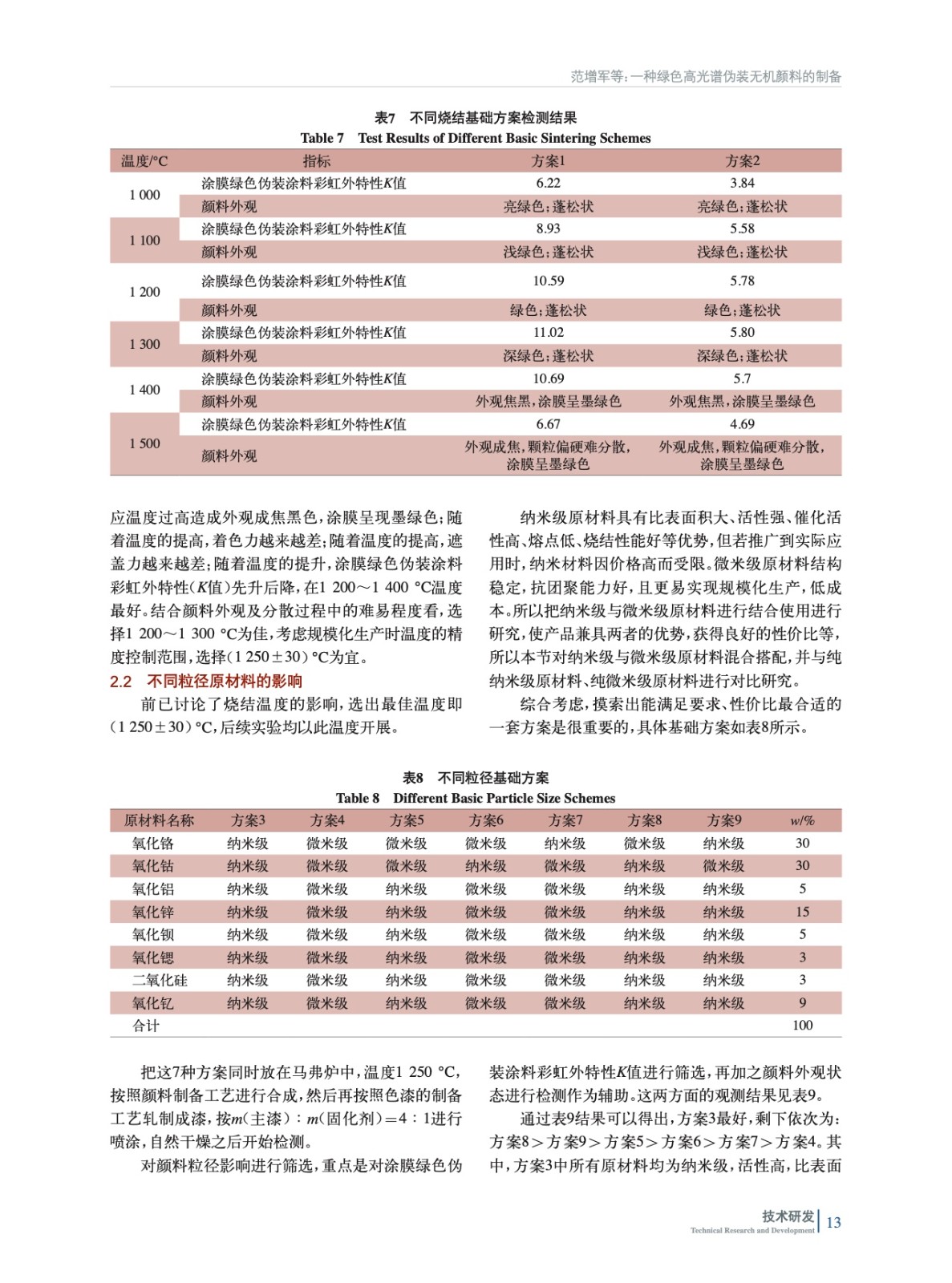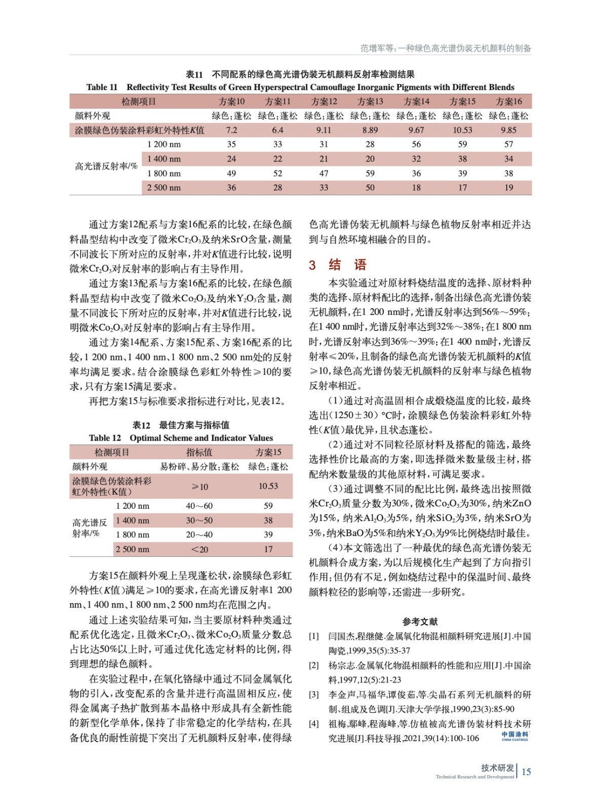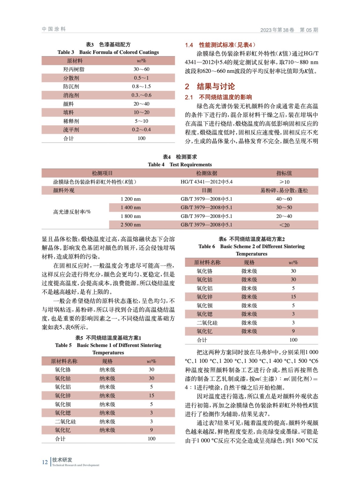 摘要:討論了燒結溫度、原材料粒徑、原材料配比3種影響因素對綠色高光譜偽裝無機顏料的影響,通過對顏料外觀、綠色偽裝涂料彩虹外特性(K值)、高光譜反射率進行評價,最終制備出滿足高光譜/超光譜探測需求的無機綠色顏料。在重要設施建筑、武器裝備和器材的偽裝保護上有廣闊的應用前景和意義。