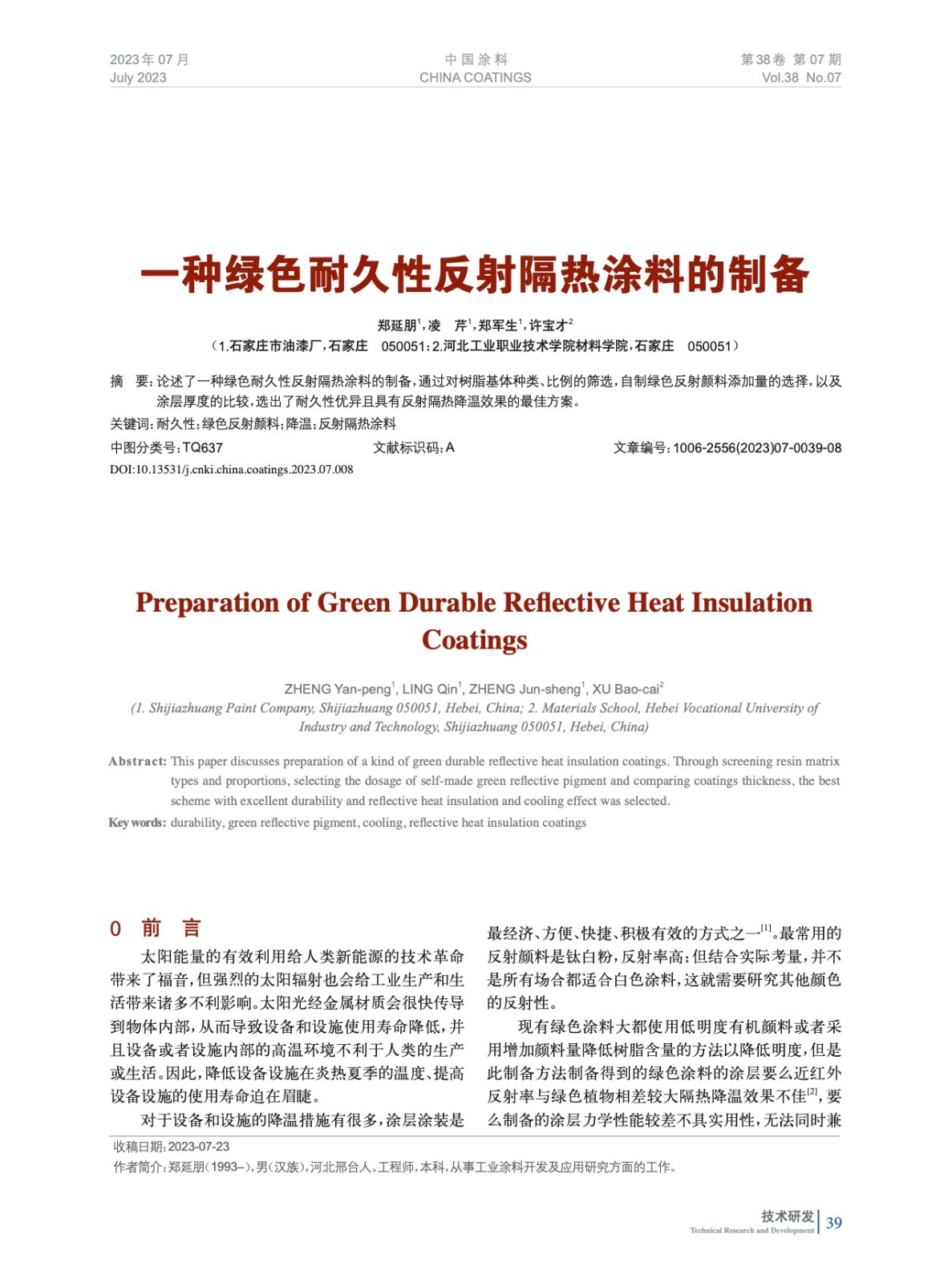 本文系作者@鄭延朋,凌 芹,鄭軍生,許寶才 授權中國涂料網發表,并經中國涂料網編輯,未經允許不得轉載,如需轉載請聯系chinacoatingnet@vip.163.com