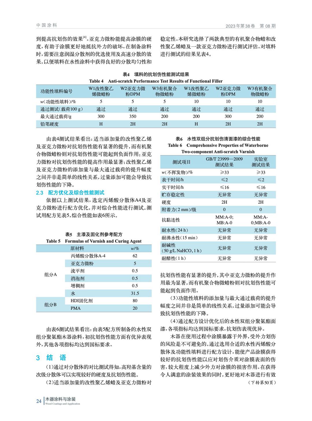 從抗劃傷的定義及測試方法兩個方面介紹了抗劃傷涂料的抗劃傷性能機理,對水性聚氨酯分散體及功能性填料進行了評估測試,通過配方設計及優化,制備了一種水性雙組分聚氨酯抗劃傷木器清面漆,并對綜合性能進行了測試。