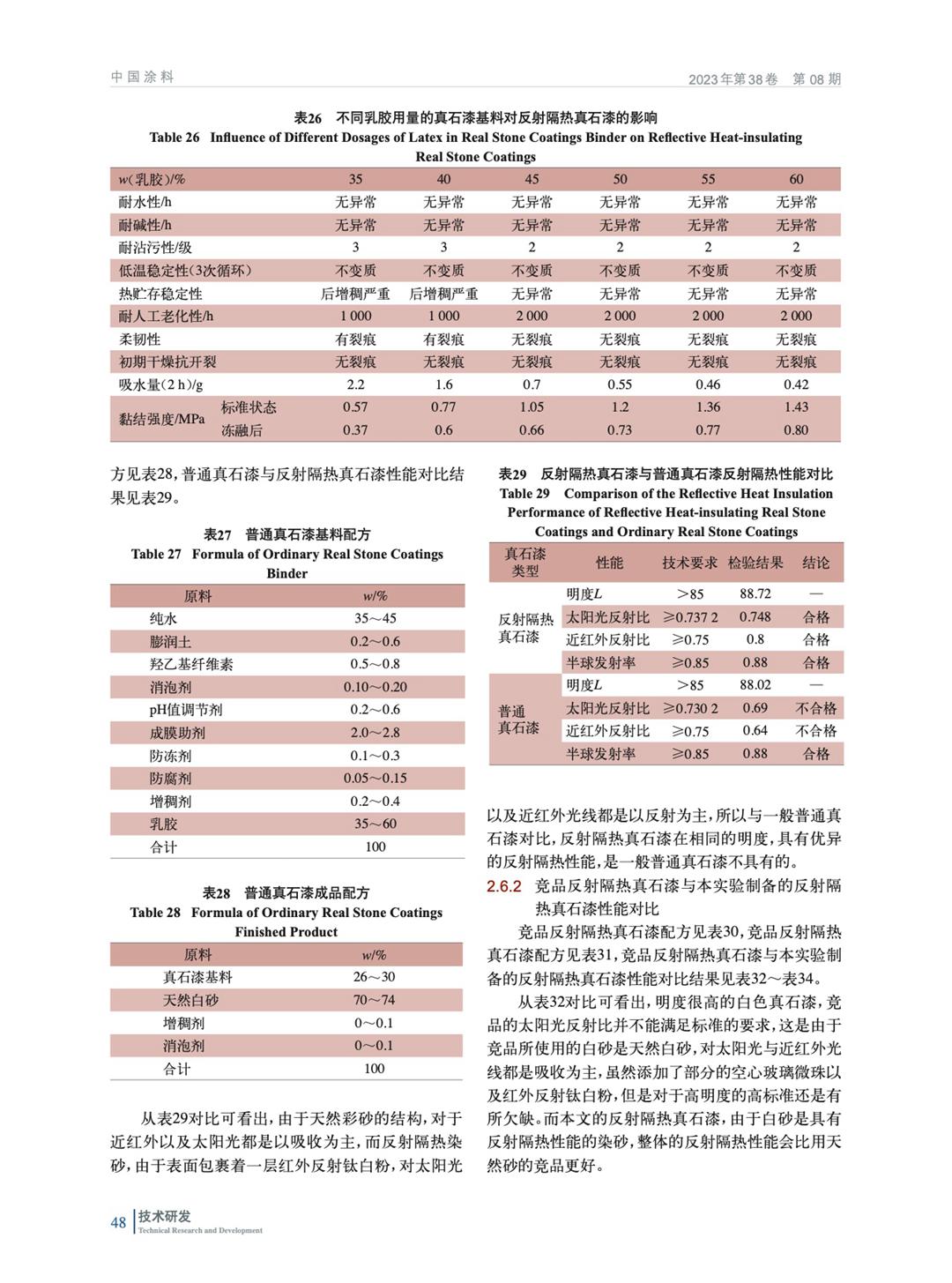 摘要:研究了不同的顏填料種類以及用量對反射隔熱染砂的耐磨性、耐水性、耐溶劑性、耐人工老化性以及反射隔熱性能的影響。結果表明:當紅外反射鈦白粉用量在25%~35%(質量分數,后同),人工染砂乳膠用量在40%~45%,雜化交聯劑用量在0.1%~0.15%,與天然雪花白進行染色處理,其制得的反射隔熱染砂,不僅具有優異的機械穩定性、顏色均勻度,而且具有優異的貯存穩定性、耐水性、耐酸性、耐堿性和耐人工老化性,添加在真石漆中具有優異的反射隔熱性能。