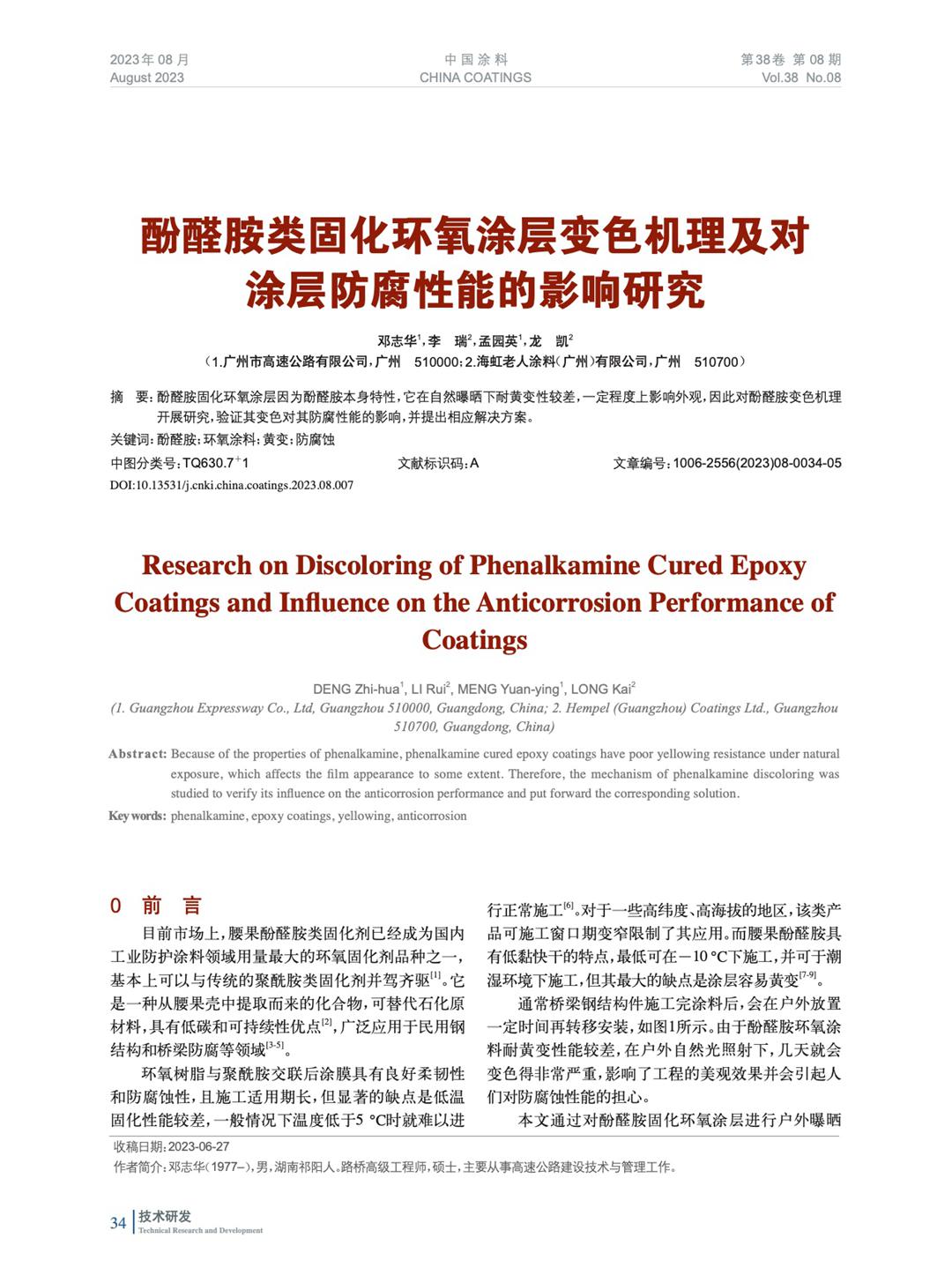 酚醛胺固化環氧涂層因為酚醛胺本身特性,它在自然曝曬下耐黃變性較差,一定程度上影響外觀,因此對酚醛胺變色機理開展研究,驗證其變色對其防腐性能的影響,并提出相應解決方案。