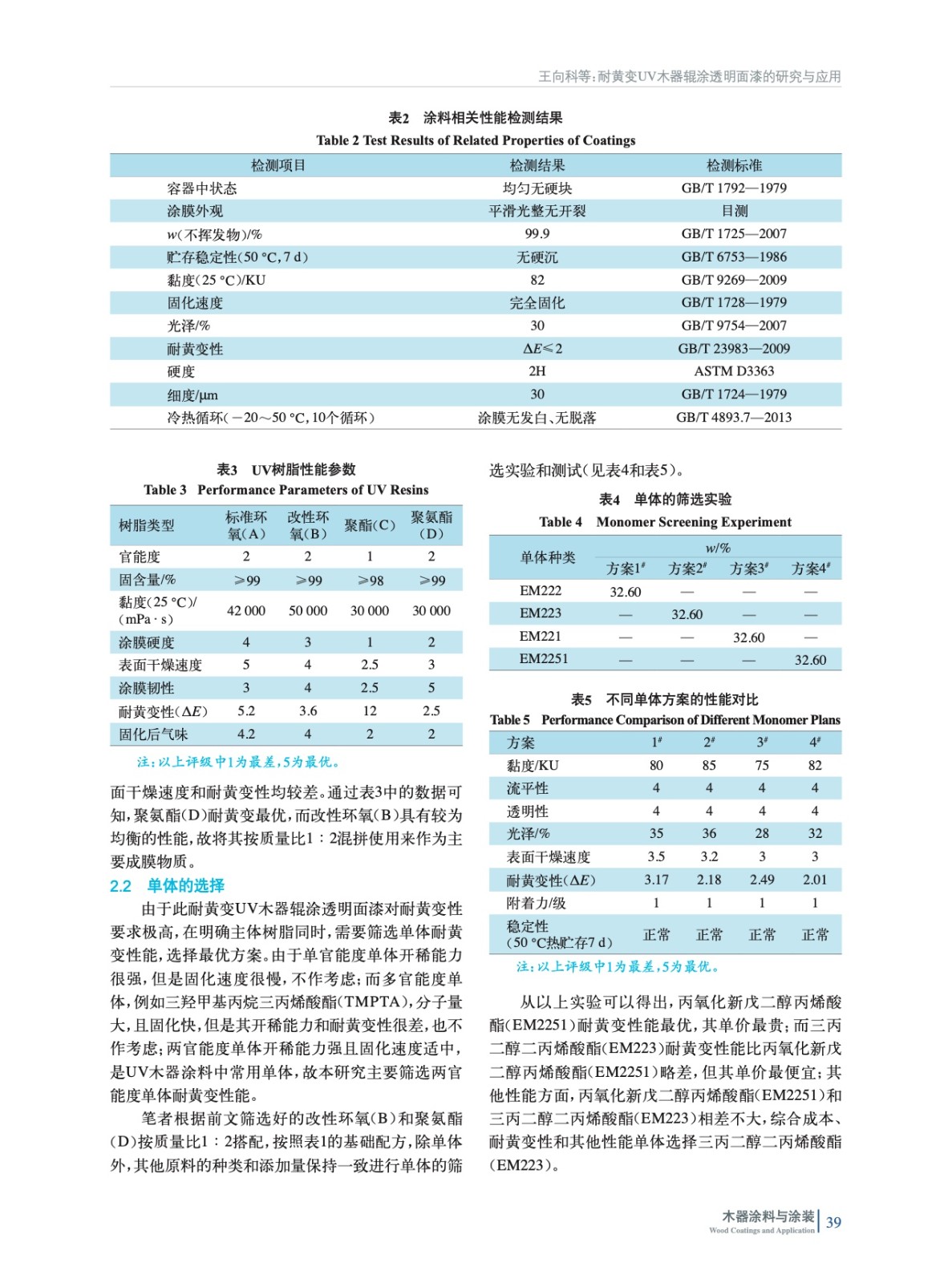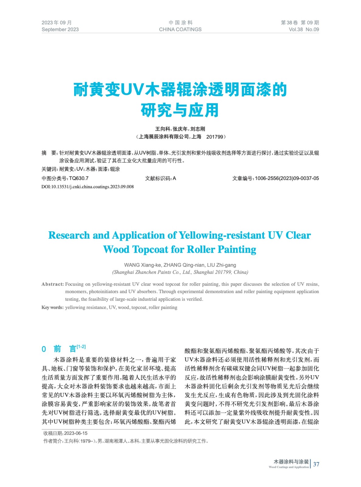 針對耐黃變UV木器輥涂透明面漆,從UV樹脂、單體、光引發劑和紫外線吸收劑選擇等方面進行探討,通過實驗論證以及輥涂設備應用測試,驗證了其在工業化大批量應用的可行性。