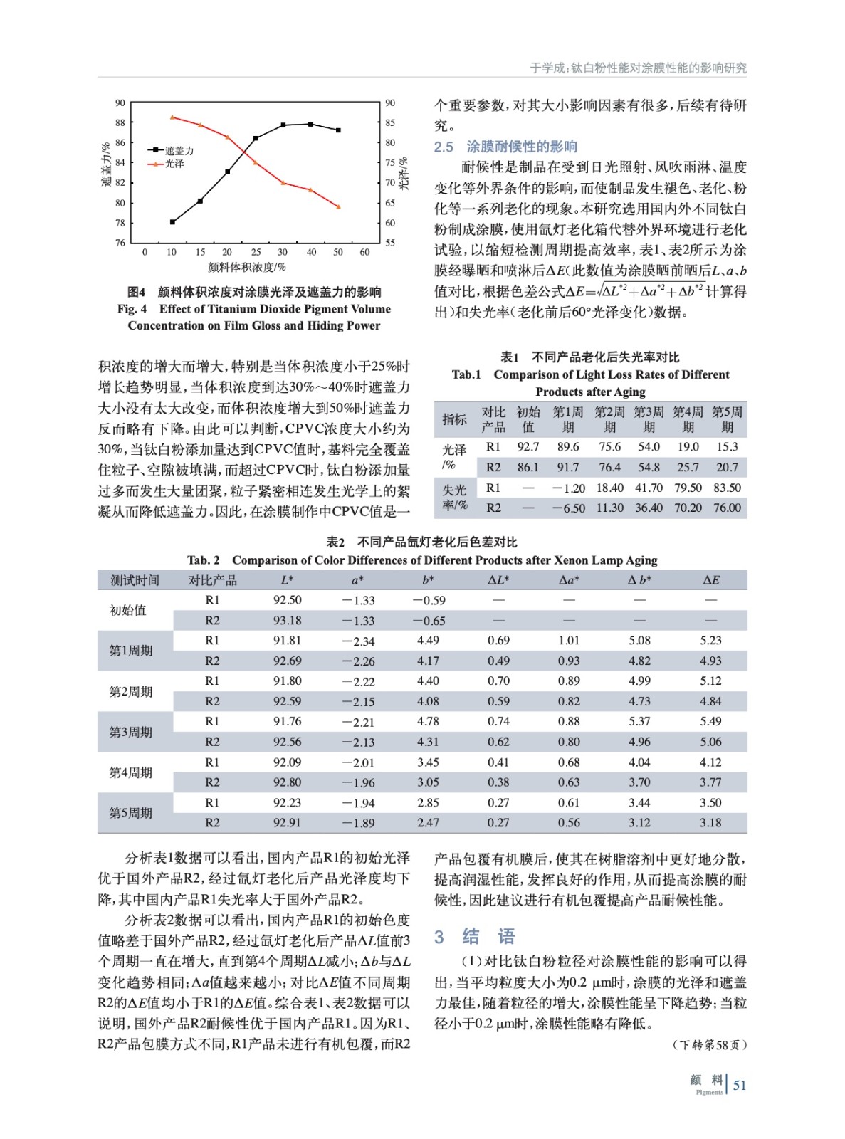 針對鈦白粉粒度、吸油量、分散性、顏料體積濃度(PVC)對涂膜性能的影響進行研究,通過對比涂膜光澤及遮蓋力的測試結果,確定鈦白粉最佳性能參數,并選取不同包覆方式的國內產品與國外產品進行老化試驗,結果顯示經有機包覆處理的國外產品R2其耐候性能更佳,建議對涂膜用鈦白粉進行有機包覆。
