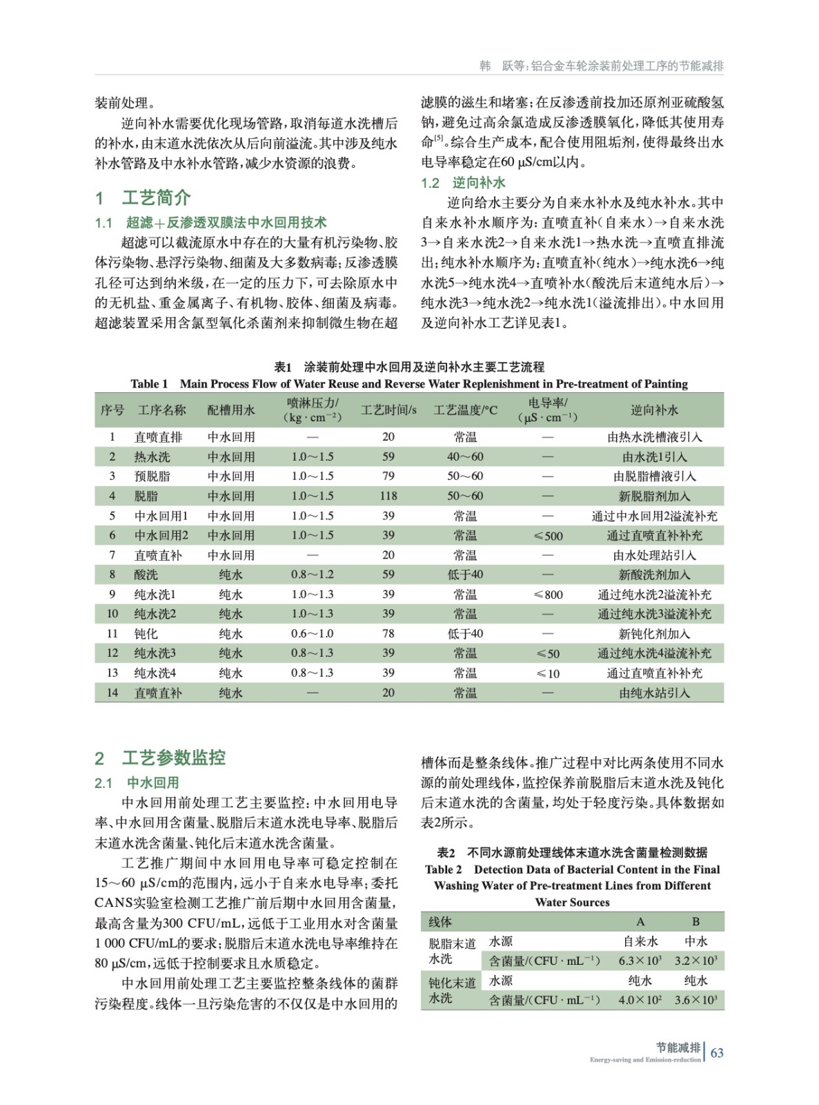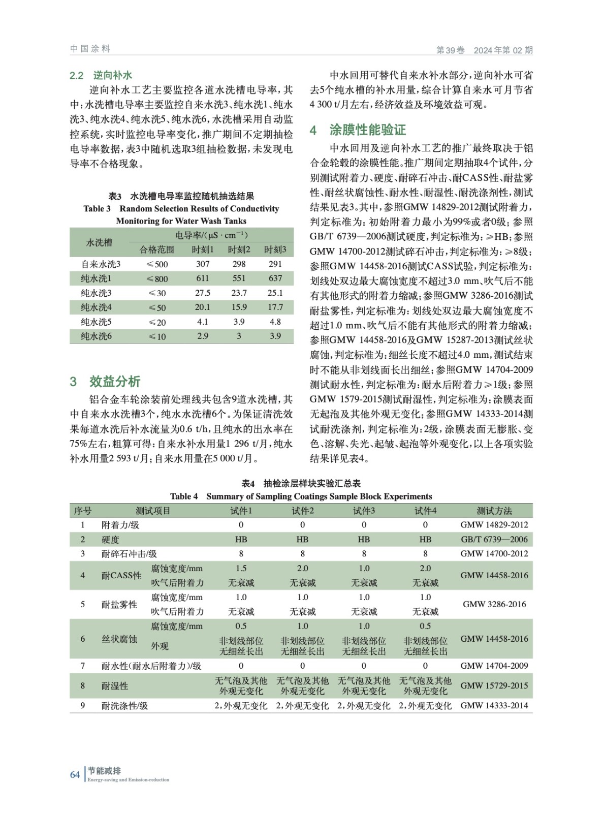 摘要:為提高水資源利用效率,達(dá)到節(jié)能降耗的目的,對(duì)鋁合金車輪前處理進(jìn)行中水回用及逆向補(bǔ)水可行性研究。優(yōu)化補(bǔ)水管路,嚴(yán)格監(jiān)控水洗槽電導(dǎo)率及末道水洗菌群污染程度;對(duì)鋁合金車輪涂膜性能(附著力、硬度、耐碎石沖擊、耐CASS試驗(yàn)、耐鹽霧性、耐絲狀腐蝕性、耐水性、耐濕性及耐洗滌劑)進(jìn)行測(cè)試。結(jié)果標(biāo)明:涂裝前處理中水回用及逆向補(bǔ)水工藝穩(wěn)定,水洗槽電導(dǎo)率及末道水洗含菌量均滿足前處理工藝指標(biāo)要求,涂膜性能合格。