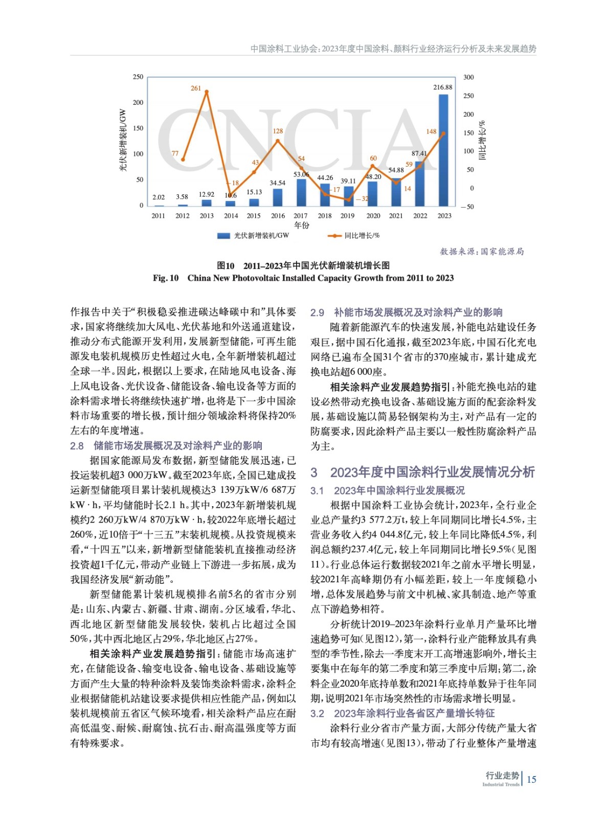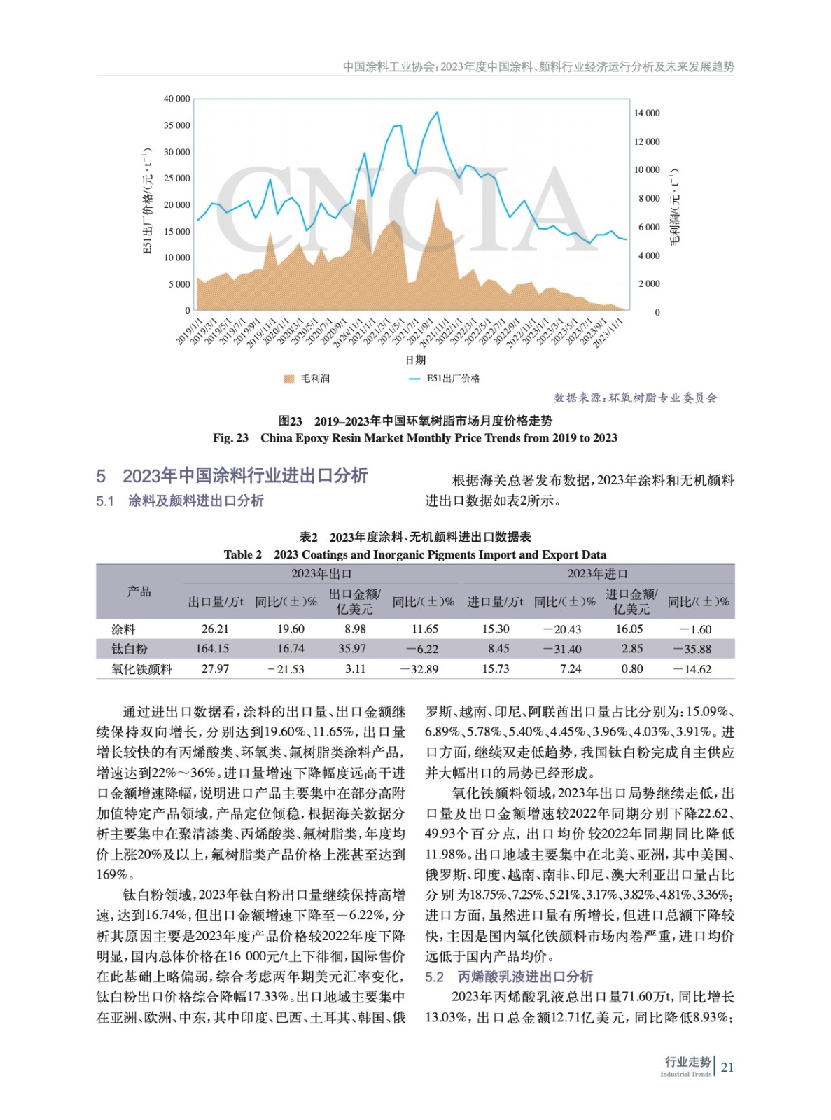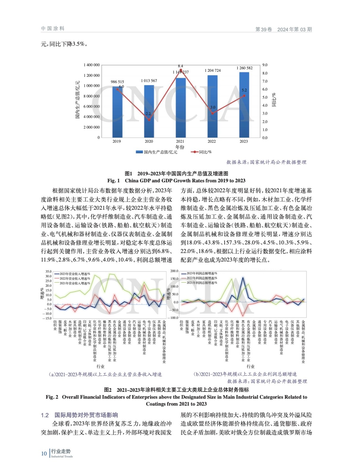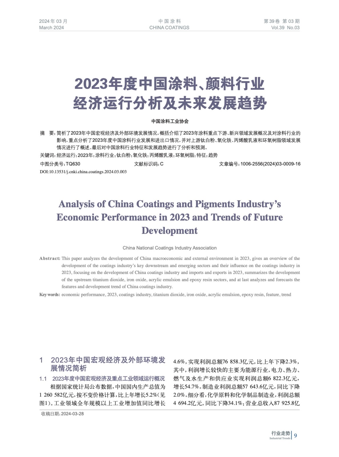 摘要:簡析了2023年中國宏觀經濟及外部環(huán)境發(fā)展情況,概括介紹了2023年涂料重點下游、新興領域發(fā)展概況及對涂料行業(yè)的影響,重點分析了2023年度中國涂料行業(yè)發(fā)展和進出口情況,并對上游鈦白粉、氧化鐵、丙烯酸乳液和環(huán)氧樹脂領域發(fā)展情況進行了概述。最后對中國涂料行業(yè)特征和發(fā)展趨勢進行了分析和預測。