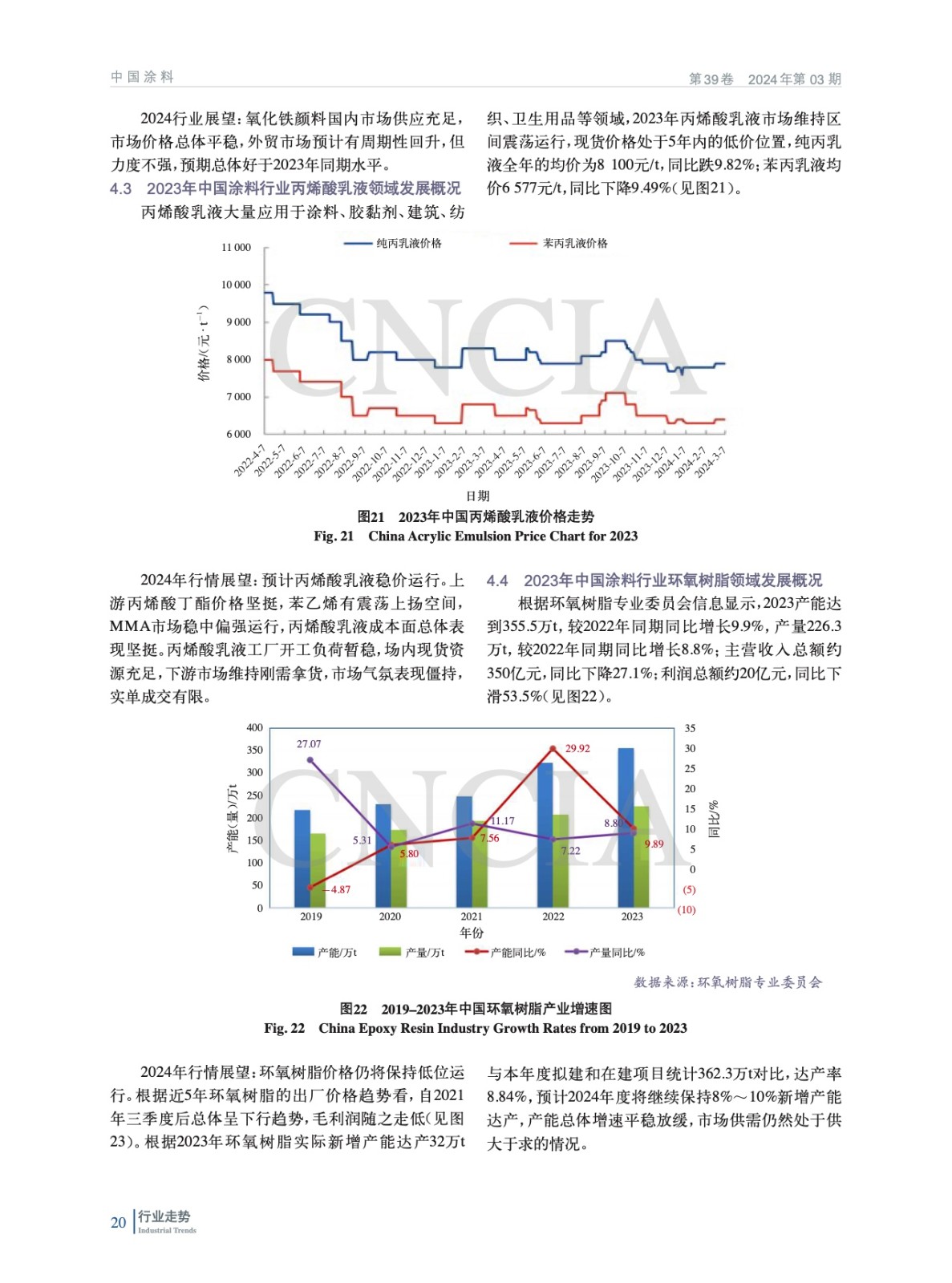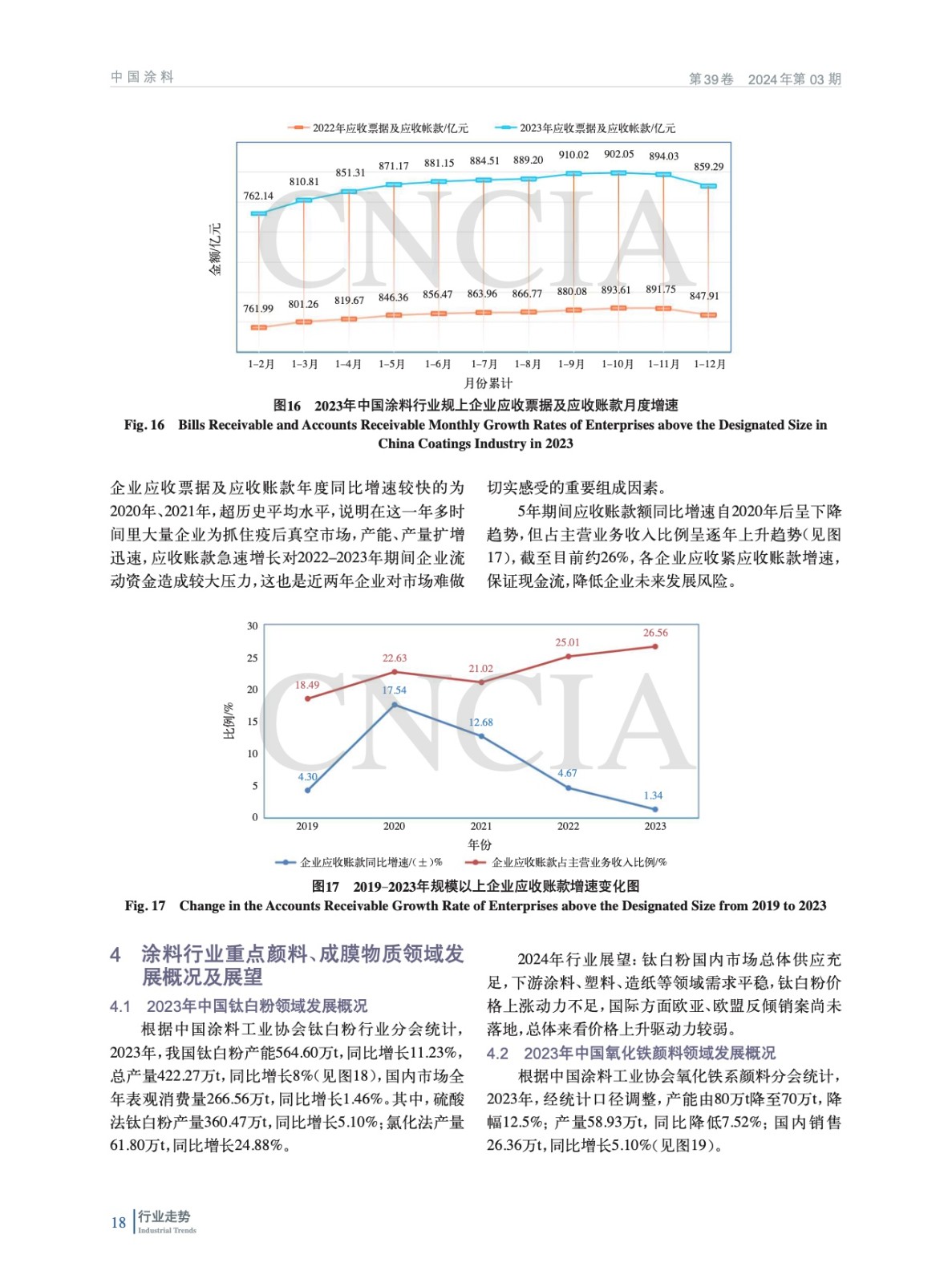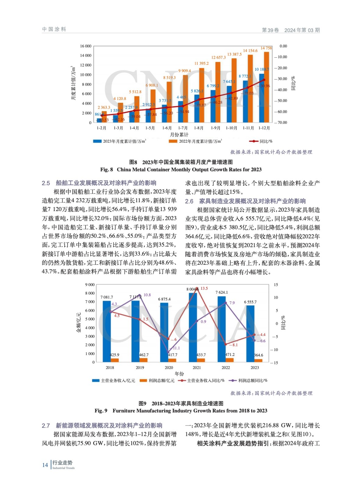摘要:簡析了2023年中國宏觀經濟及外部環(huán)境發(fā)展情況,概括介紹了2023年涂料重點下游、新興領域發(fā)展概況及對涂料行業(yè)的影響,重點分析了2023年度中國涂料行業(yè)發(fā)展和進出口情況,并對上游鈦白粉、氧化鐵、丙烯酸乳液和環(huán)氧樹脂領域發(fā)展情況進行了概述。最后對中國涂料行業(yè)特征和發(fā)展趨勢進行了分析和預測。