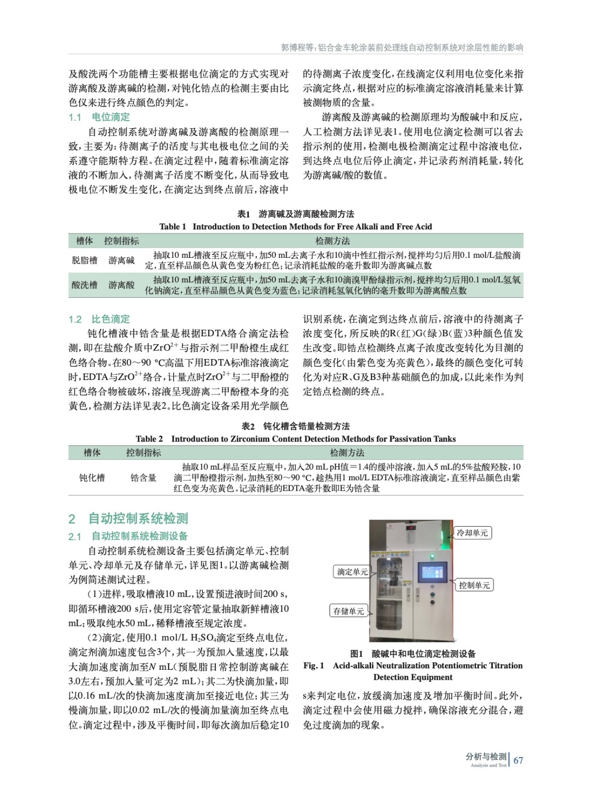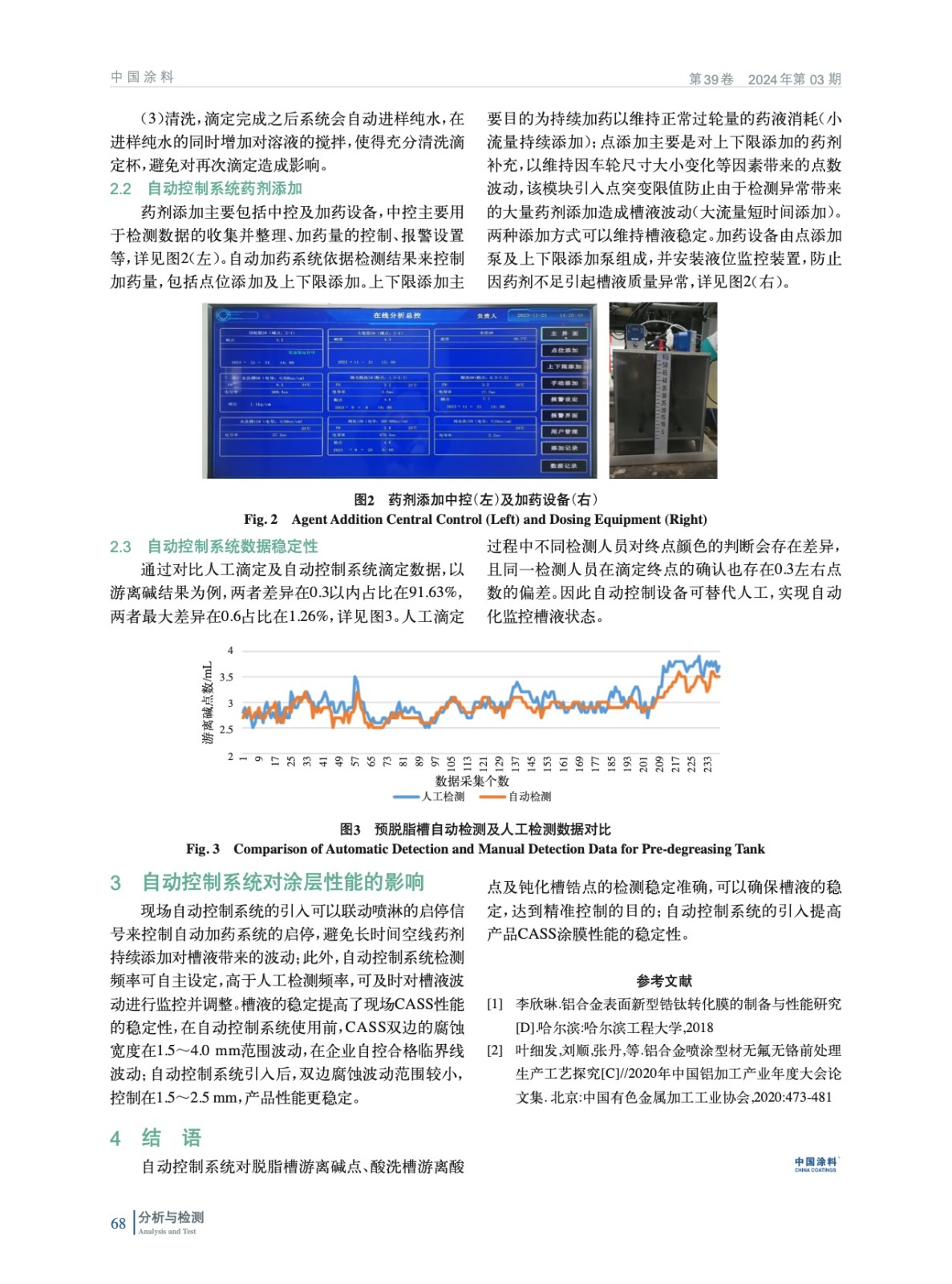 摘要:為提升鋁合金車輪涂裝線自動化程度,在涂裝前處理引入自動監(jiān)控系統(tǒng)。確定游離堿、游離酸及鋯點的檢測方法,依據(jù)檢測結(jié)果自動調(diào)整加藥量。對比人工與設(shè)備檢測結(jié)果,監(jiān)控設(shè)備運行穩(wěn)定性。