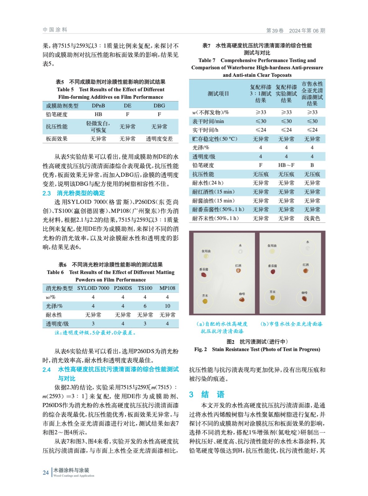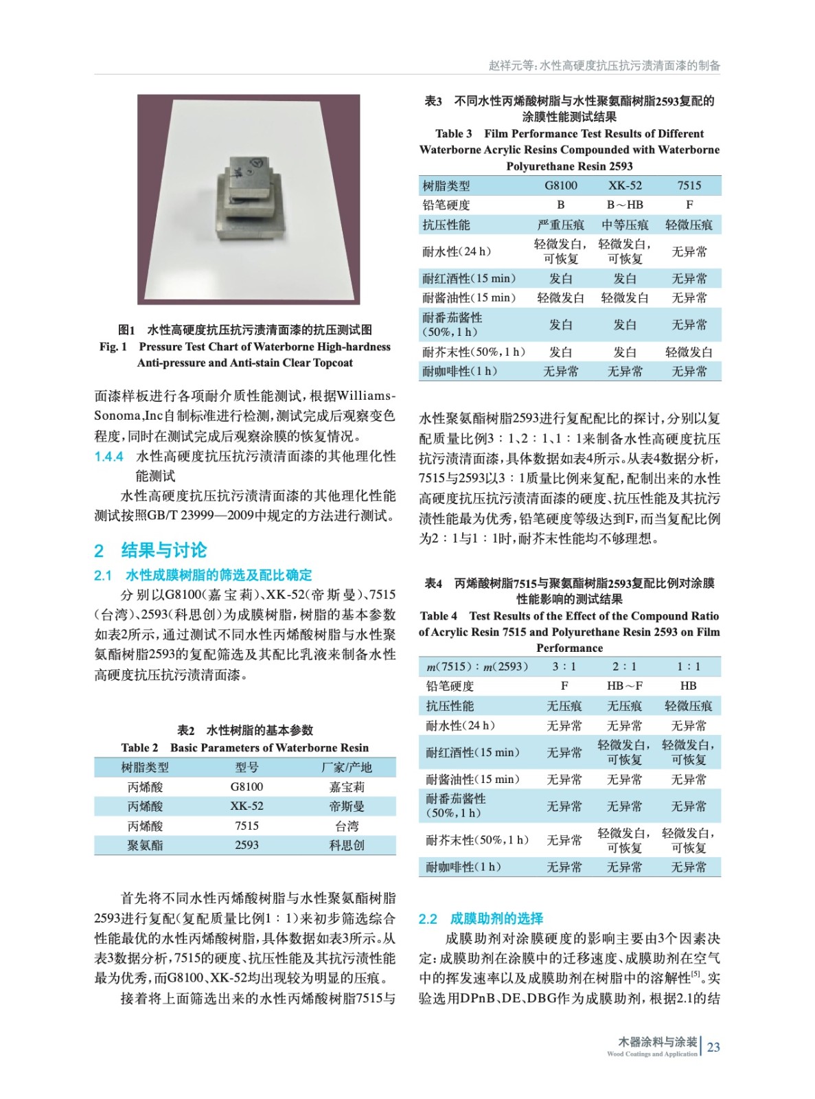 摘要:以水性樹脂、消光粉和其他助劑為原料,通過配方優化改進,制備了一種抗壓抗污漬高硬度的水性清面漆。探討了不同水性丙烯酸樹脂與水性聚氨酯樹脂的復配篩選及其配比、不同的成膜助劑和消光粉的種類對最終研制的水性全亞光(光澤為2%~5%)高硬度抗壓抗污漬清面漆的硬度、抗壓性能、抗污漬性和透明度的影響。按照GB/T 6739—2006《色漆和清漆鉛筆法測定漆膜硬度》標準進行測試,對涂膜的硬度進行評估。結果表明:當配方采用水性樹脂7515與2593[復配比例m(7515)∶m(2593)=3∶1]、成膜助劑DE、消光粉P260DS時,搭配質量分數1%的增強劑(氮吡啶),最終開發的水性高硬度抗壓抗污漬清面漆的涂膜抗壓性能、硬度表現和抗污漬均達到最佳,其中鉛筆硬度等級達到F。