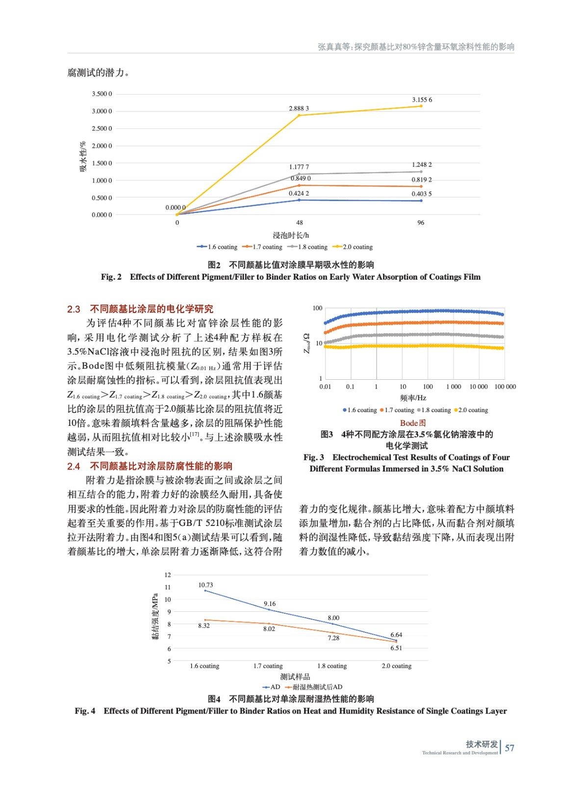 摘要:在80%鋅含量環(huán)氧涂料中,以長石粉作為另一種輔助顏填料,通過改變總顏填料與基料的比例(即顏基比),制備了臨界狀態(tài)附近4種不同顏基比(1.6、1.7、1.8以及2.0)的涂料樣品,并探究了顏基比對涂膜形成結(jié)構(gòu)以及涂膜防腐蝕性能的影響。測試結(jié)果顯示,隨著顏基比的增加,4種測試涂層的吸水率增大,96 h泡水測試后,顏基比為2.0的涂層吸水率約為1.6顏基比涂層的7.8倍;電化學測試Bode圖中低頻阻抗模量(Z0.01 Hz)減小,1.6顏基比涂層的阻抗值約為2.0顏基比涂層阻抗值的10倍,意味著涂層的阻隔性能減弱;連續(xù)冷凝、耐鹽霧以及耐濕熱防腐測試后涂膜的附著力均有所降低,表明了涂膜的防腐性能降低。盡管顏基比越高涂料的價格降低,但從環(huán)氧富鋅底漆應具備良好的防銹性能再追求性價比的角度考慮,顏基比建議不高于2.0,以確保防腐測試后涂層仍具有優(yōu)異的附著力(不低于5 MPa)。