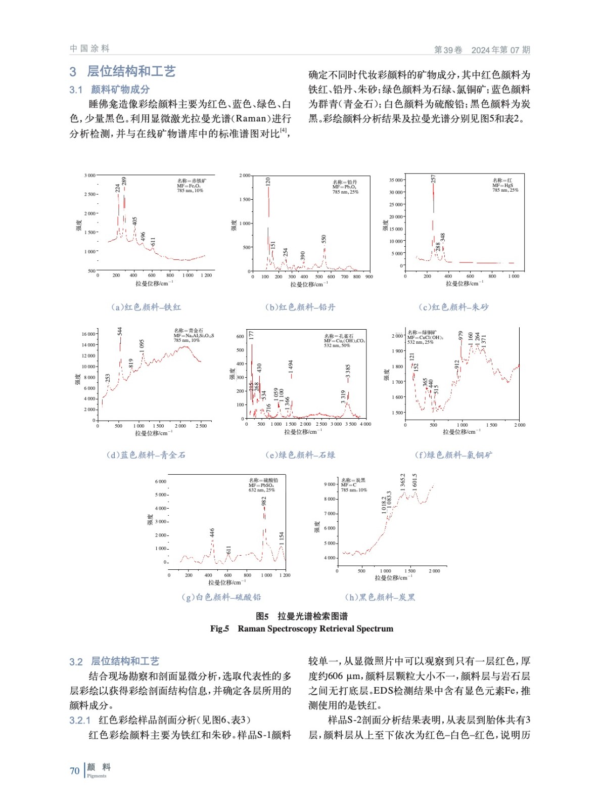 摘要:睡佛龕開鑿于唐高宗末至武周時期,造像多次妝彩。以睡佛龕造像彩繪為研究對象,應用Raman、XRF、XRD、SEM-EDS、PY-GC-MS等多種檢測方法對彩繪顏料層進行分析研究,結果表明:歷史上造像妝彩多達3次,彩繪紅色顏料為鐵紅、鉛丹、朱砂,藍色顏料為青金石,綠色顏料為堿式氯化銅、石綠,白色顏料為硫酸鉛,黑色顏料為炭黑,膠結材料為動物膠。該研究成果為后續保護修復工作提供了科學依據。