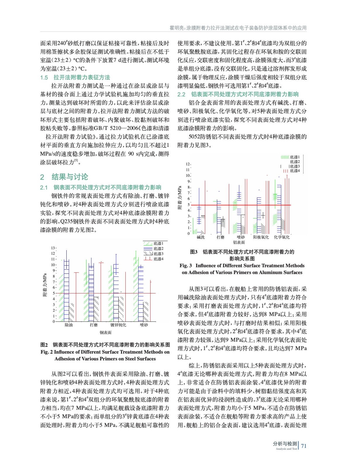 摘要:采用拉開法對艦載電子裝備上常用的Q235鋼和5052防銹鋁表面的底漆涂膜的附著力進行拉開法定量測試,對同種基材的不同表面處理方式對同種底漆涂膜附著力的影響進行比較,同時也對比了4種底漆在相同基材和表面處理時的附著力差異。通過拉開后的截面圖和底漆本身的特性解釋了附著力差異的原因,給出了Q235鋼和5052防銹鋁表面不同表面處理方式時的底漆選用建議。