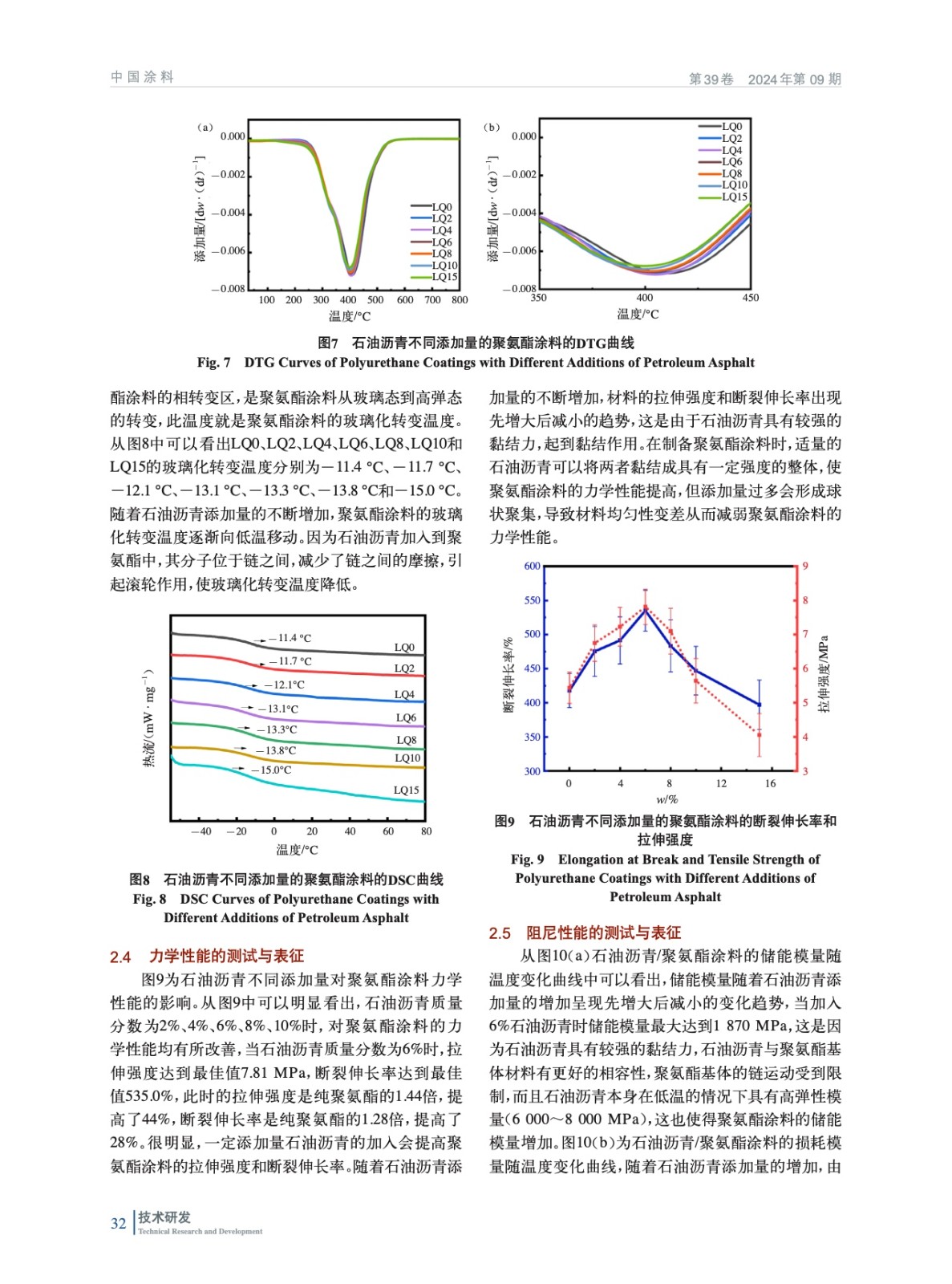 摘要:將石油瀝青作為填料加入聚氨酯涂料中,通過相關測試表征來探究石油瀝青對聚氨酯涂料阻尼性能的影響。測試發現,隨著石油瀝青添加量的增加,涂料的儲能模量、損耗模量以及損耗因子都呈現出先增大后減小的趨勢,當石油瀝青添加量為6%(質量分數,后同)時,儲能模量和損耗模量得到提升,同時損耗因子的峰值達到最大為0.94。石油瀝青的加入使聚氨酯涂料的力學性能也得到改善,當石油瀝青添加量為6%時,拉伸強度達到7.81 MPa,是純聚氨酯涂料的1.44倍;斷裂伸長率達到535.0%,是純聚氨酯涂料的1.28倍。