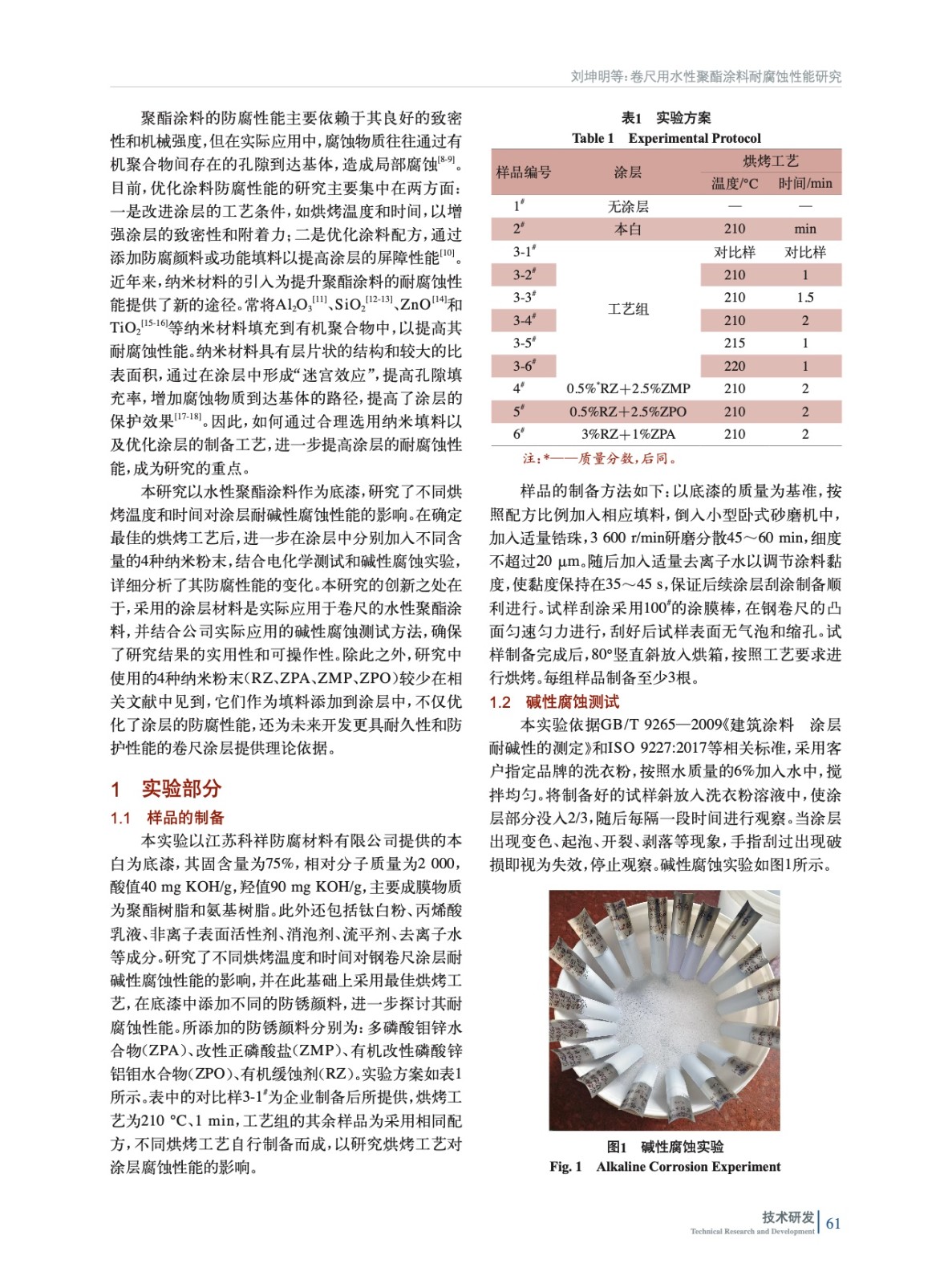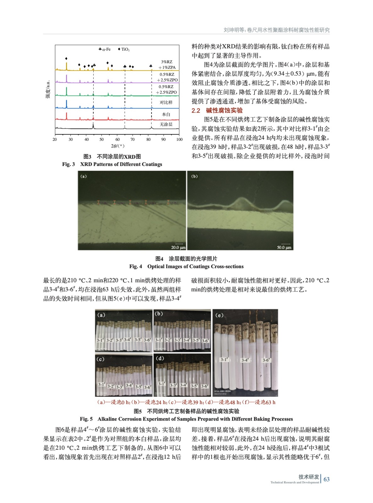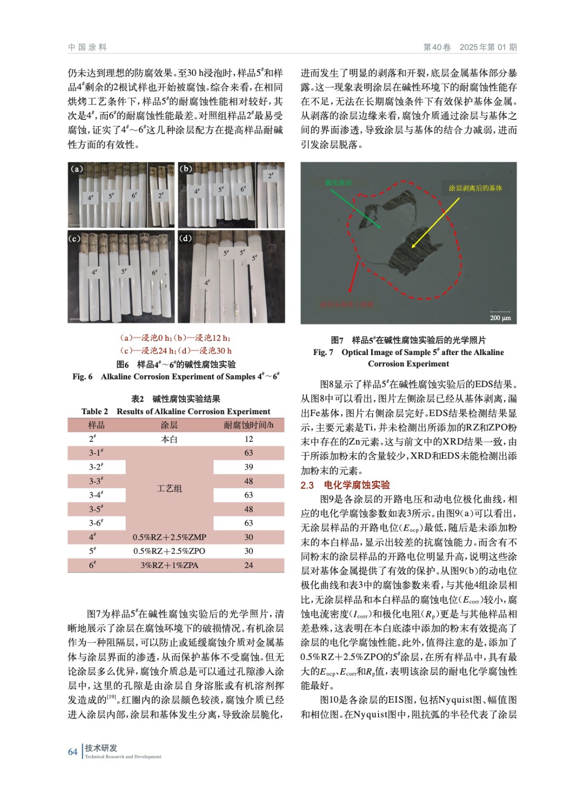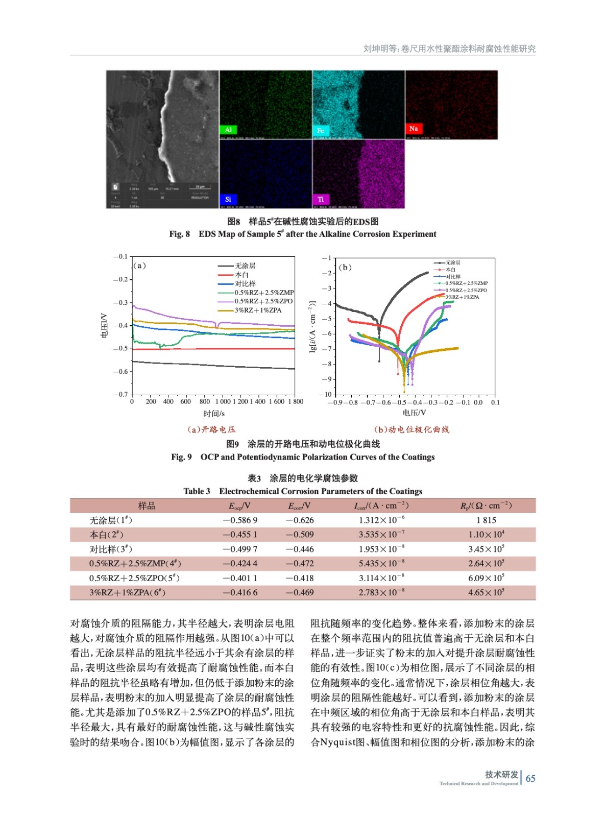 摘要:以水性聚酯涂料為底漆,研究了不同烘烤工藝對涂層耐堿性腐蝕的影響。在確定最佳烘烤工藝(210 ℃、2 min)后,實驗加入了多磷酸鉬鋅水合物(ZPA)、改性正磷酸鹽(ZMP)、有機改性磷酸鋅鋁鉬水合物(ZPO)、有機緩蝕劑(RZ)4種納米粉末,結(jié)合電化學(xué)測試和堿性腐蝕實驗,評估其對涂層耐腐蝕性能的影響。實驗結(jié)果表明,加入納米粉末后,涂層的耐腐蝕性能顯著提升,尤其是添加0.5%(質(zhì)量分數(shù),后同)RZ+2.5%ZPO的涂層表現(xiàn)出最佳的電化學(xué)耐腐蝕性能。該研究為開發(fā)高性能卷尺用聚酯涂層提供了有效的理論依據(jù)與實驗支持。