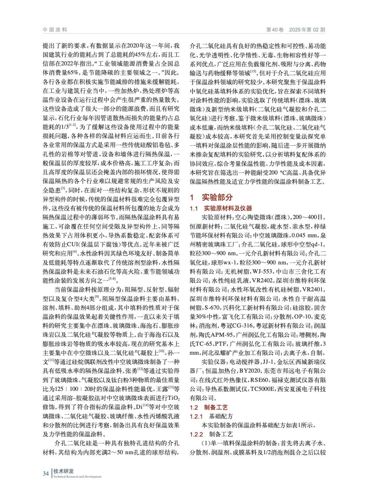 摘要:針對工業節能領域對高溫保溫材料的迫切需求,針對傳統涂層在200 ℃溫區存在的厚度過大、施工工藝復雜及功能單一等問題,系統開展保溫涂層的研發。選取無機體系樹脂作為成膜物質,采用以SiO2為主要成分的漂珠、玻璃微珠、氣凝膠和介孔二氧化硅為填料,通過中空或多孔結構降低熱傳導,且適配多種基體的分散性,實現高效隔熱與工藝兼容性。實驗考察了不同樹脂、填料、顏基比及復配比例對保溫涂料隔熱溫差、導熱系數、硬度和附著力的影響。結果發現,以無機體系樹脂WJ-553為成膜樹脂,顏基比1.5∶1,中空玻璃微珠與球形介孔二氧化硅填料總質量分數為30%,球形介孔二氧化硅摻雜量為4%時,保溫涂料導熱系數可達0.086 W/(m·K),硬度6B,附著力等級為1級,耐溫性能突破200 ℃閾值。該研究成果為開發兼具高效隔熱、機械可靠及施工便利的新型工業保溫涂層提供了理論依據和技術方案,在高溫管道、工業窯爐等節能領域展現出重要應用價值。
