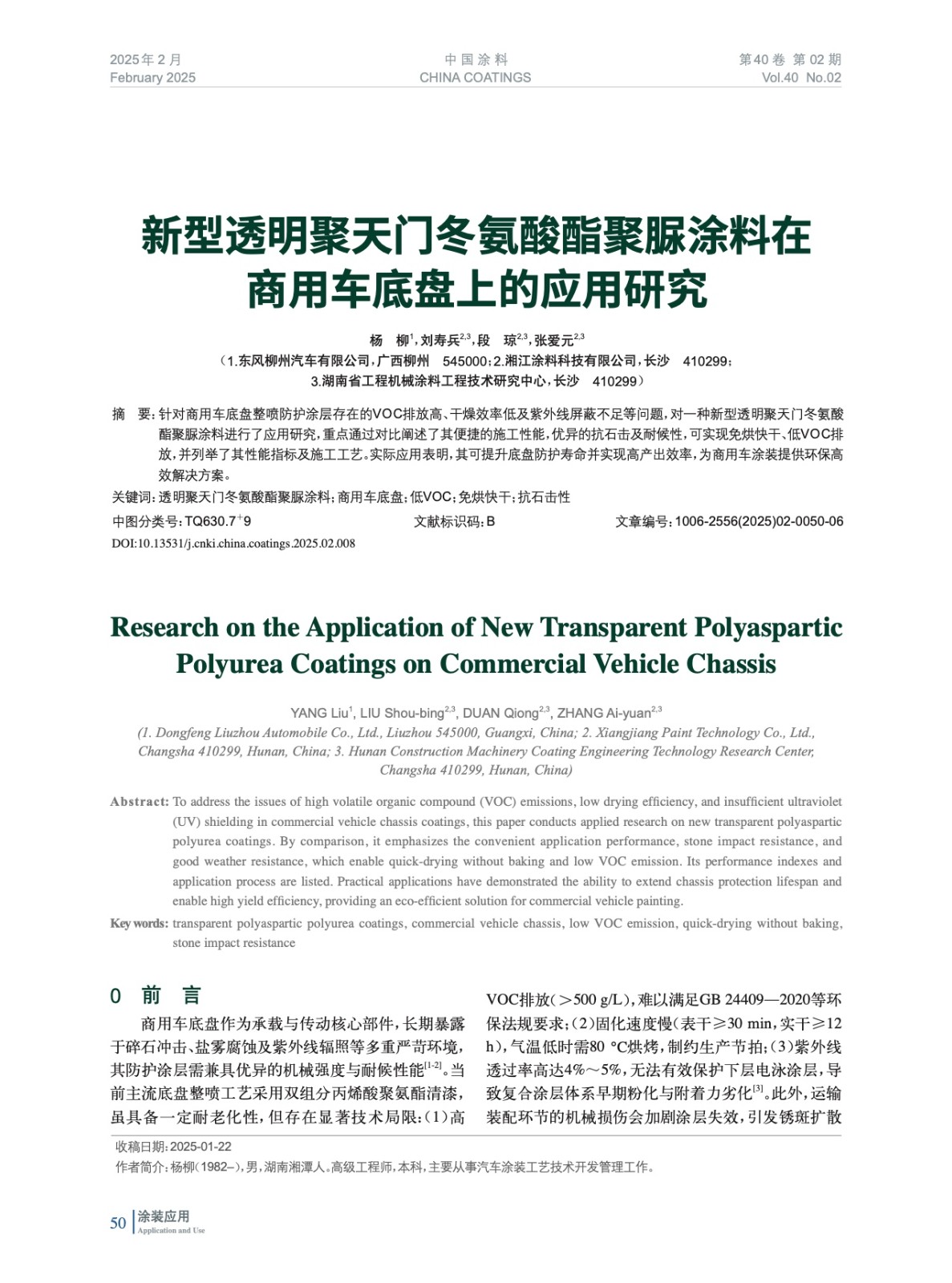 摘要:針對(duì)商用車底盤整噴防護(hù)涂層存在的VOC排放高、干燥效率低及紫外線屏蔽不足等問(wèn)題,對(duì)一種新型透明聚天門冬氨酸酯聚脲涂料進(jìn)行了應(yīng)用研究,重點(diǎn)通過(guò)對(duì)比闡述了其便捷的施工性能,優(yōu)異的抗石擊及耐候性,可實(shí)現(xiàn)免烘快干、低VOC排放,并列舉了其性能指標(biāo)及施工工藝。實(shí)際應(yīng)用表明,其可提升底盤防護(hù)壽命并實(shí)現(xiàn)高產(chǎn)出效率,為商用車涂裝提供環(huán)保高效解決方案。