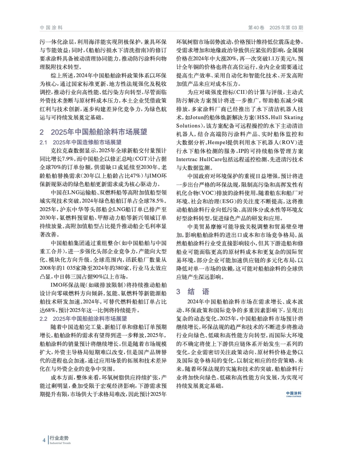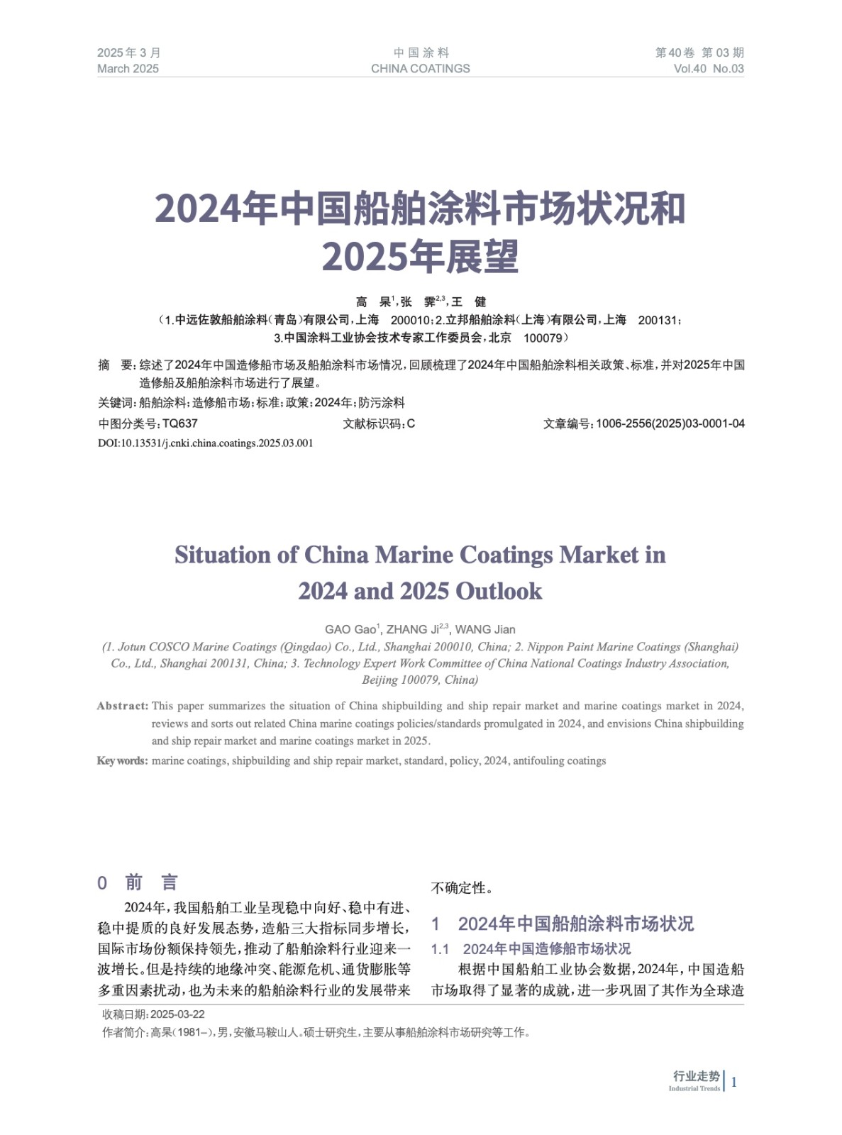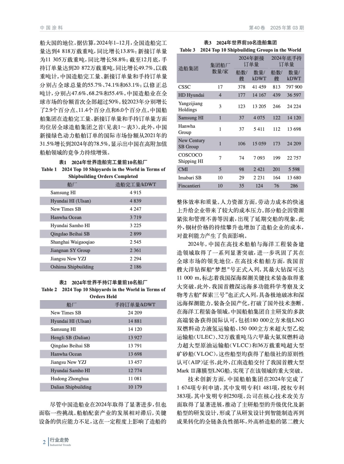 摘要:綜述了2024年中國造修船市場及船舶涂料市場情況,回顧梳理了2024年中國船舶涂料相關(guān)政策、標(biāo)準(zhǔn),并對2025年中國造修船及船舶涂料市場進(jìn)行了展望。