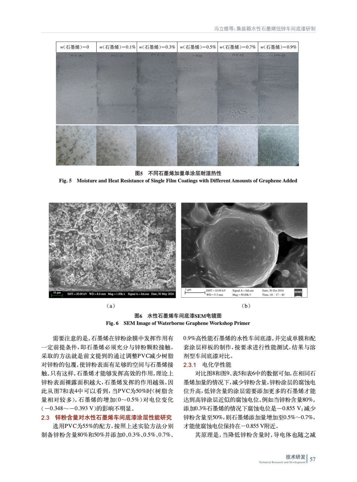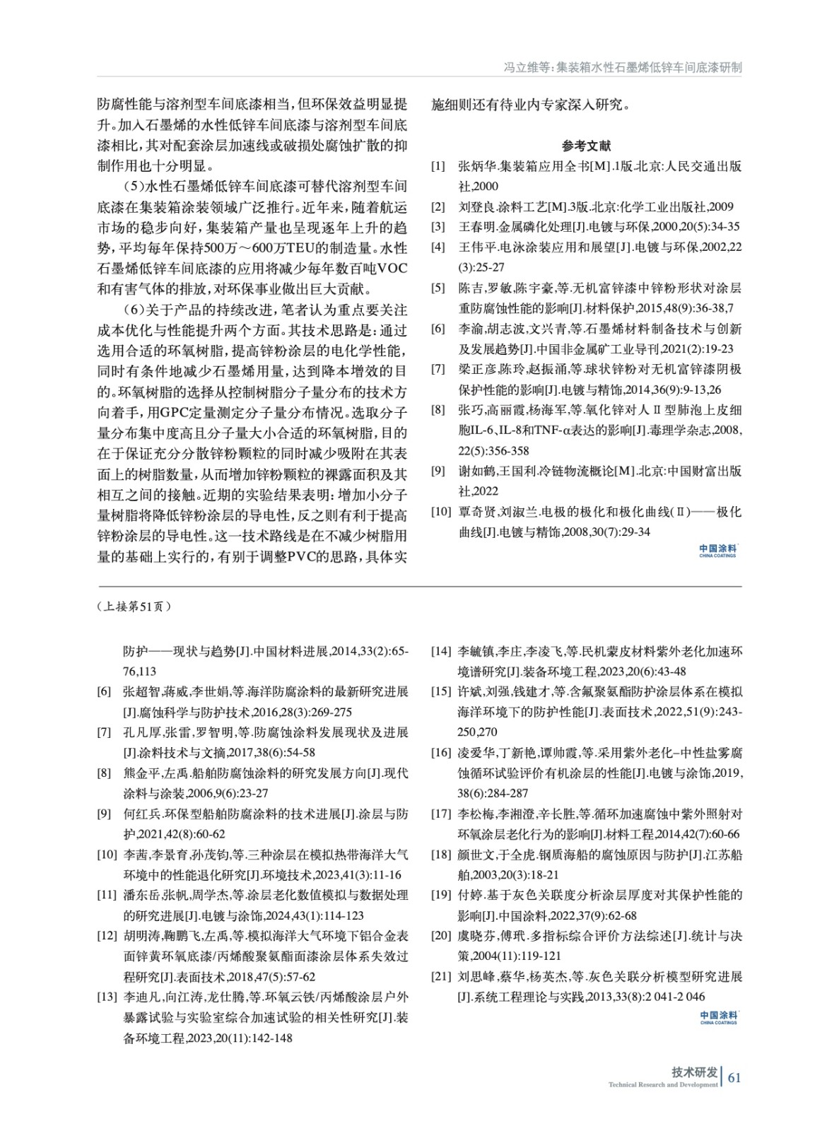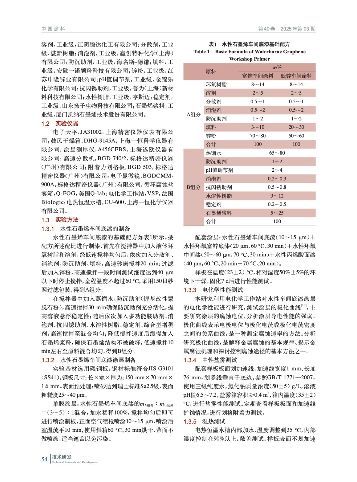 摘要:研制一款用于集裝箱的水性石墨烯低鋅車間底漆,使其性能與溶劑型車間底漆相當,并具有明顯的環境友好優勢。通過減少鋅含量的方法降低有害氣體濃度,保護人體健康安全。鋅含量降低導致電化學性能下降的問題,可通過調整鋅粉漆顏料體積濃度(PVC),同時添加一定量石墨烯的方法加以改善,使最終性能接近溶劑型車間底漆的水平,并滿足其臨時防腐的設計要求。將鋅粉漆配方的PVC調整至55%,鋅粉含量調整至50%(質量分數,后同),石墨烯加量0.7%,得到的車間底漆涂層的電極電位小于-0.8 V,經過35 ℃濕熱環境2周的測試,沒有出現銹蝕現象,通過了臨時防腐性能的測試要求。其配套涂層的耐鹽霧性能與溶劑型車間底漆相當,加速線擴蝕速度明顯減緩。在滿足其設計要求的基礎上實現了保護環境和人體健康安全的目的。