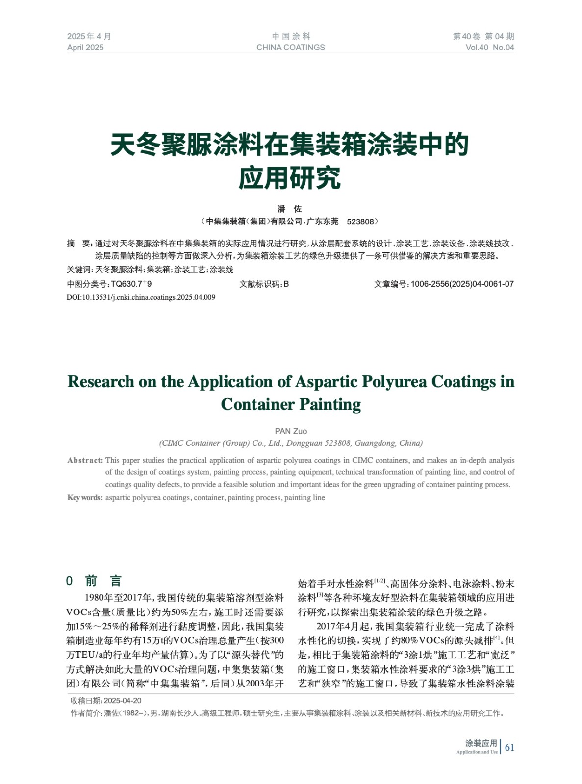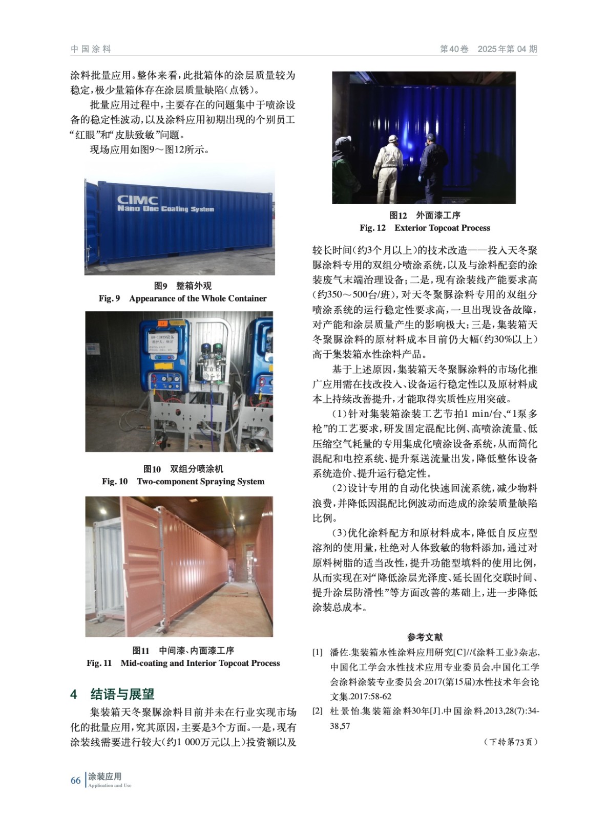 通過對天冬聚脲涂料在中集集裝箱的實際應用情況進行研究,從涂層配套系統的設計、涂裝工藝、涂裝設備、涂裝線技改、涂層質量缺陷的控制等方面做深入分析,為集裝箱涂裝工藝的綠色升級提供了一條可供借鑒的解決方案和重要思路。