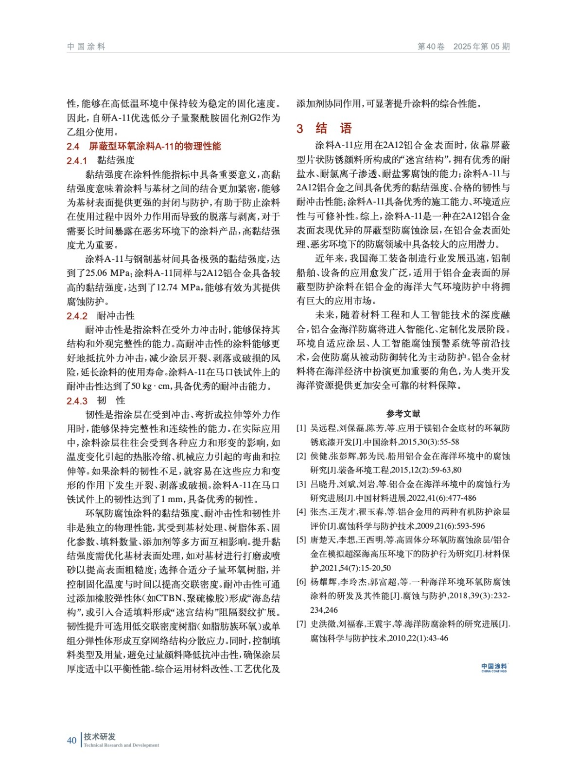 摘要:研發了一種適用于鋁合金表面的屏蔽型防腐蝕涂層A-11,通過調節其屏蔽填料用量、固化劑種類對其在2A12鋁合金表面的耐鹽霧性、氯離子屏蔽性能展開研究,并對其物理性能進行了表征,包括黏結強度、韌性、耐沖擊性能等。結果表明,當鋁粉含量為15質量份,環氧涂層A-11對2A12鋁合金具備良好的耐鹽霧、耐鹽水、防銹蝕能力,在1 440 h的中性鹽霧試驗過程中,做到無起泡、無銹蝕、無脫落;在720 h的鹽水浸泡試驗中無起泡、無銹蝕、無脫落。另外環氧涂層A-11在2A12鋁合金表面具備良好的黏結強度,達到了12.74 MPa;具備較為良好的韌性與耐沖擊性能。同時,研發的涂層A-11具備良好的施工性能,未來在鋁制船舶、設備、海工裝備等的腐蝕防護中具有積極作用。