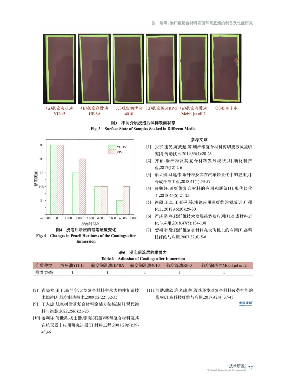 制備出一種用于碳纖維復合材料表面的環氧底漆,并對涂層與復合材料之間的結合力進行了研究,分析了涂層的耐介質、防腐蝕等性能,結果表明環氧底漆與復合材料之間具有良好的結合力,涂層具有優良的綜合性能,對碳纖維復合材料有優秀的防護作用。