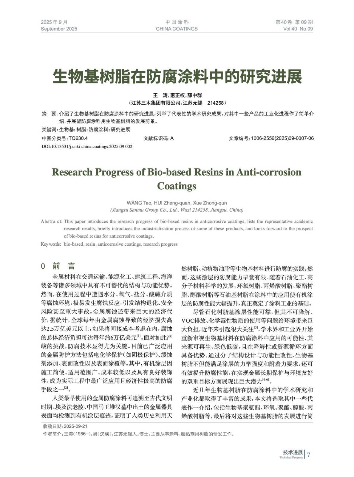 介紹了生物基樹脂在防腐涂料中的研究進展,列舉了代表性的學術研究成果,對其中一些產品的工業化進程作了簡單介紹,并展望防腐涂料用生物基樹脂的發展前景。