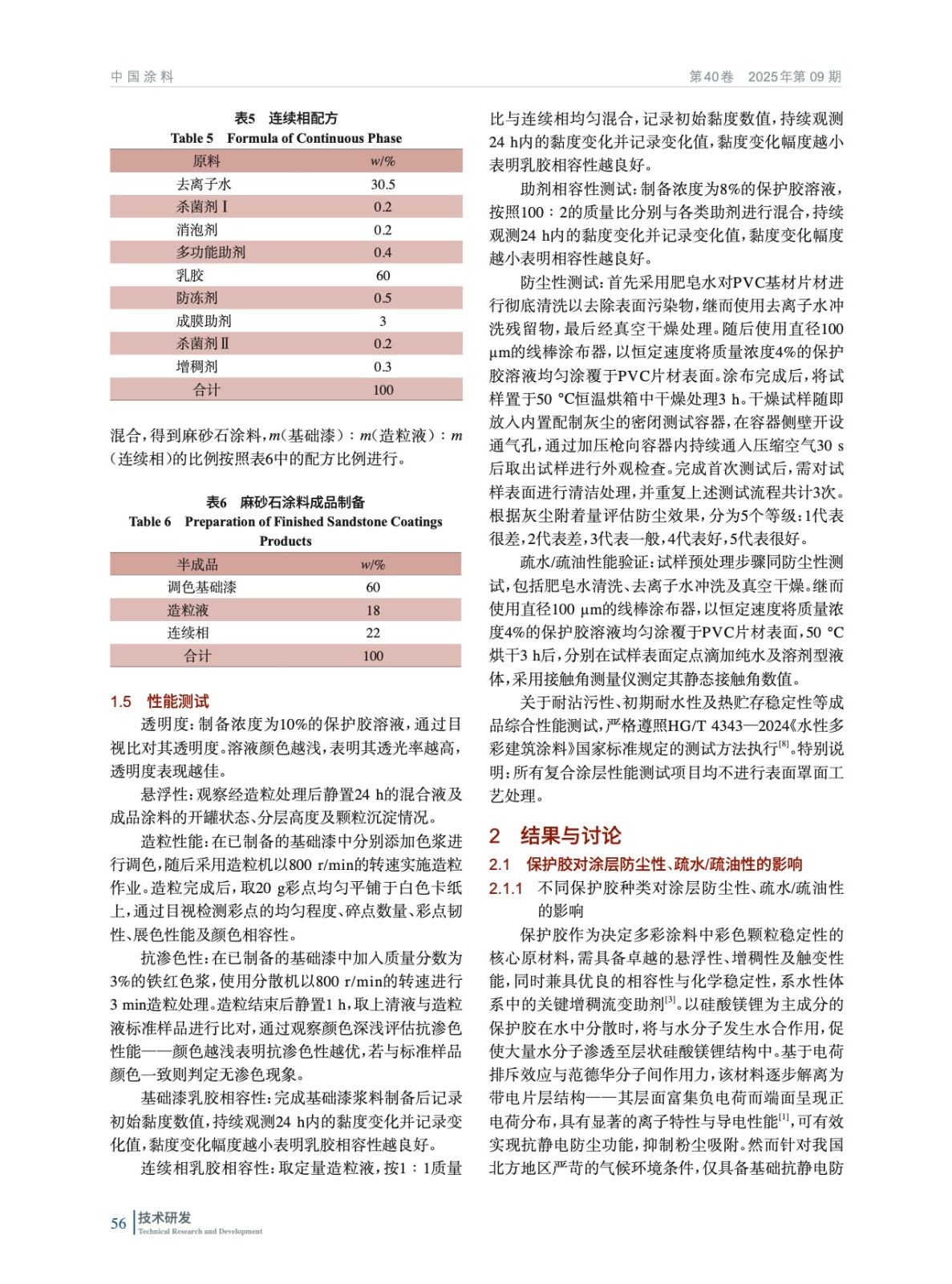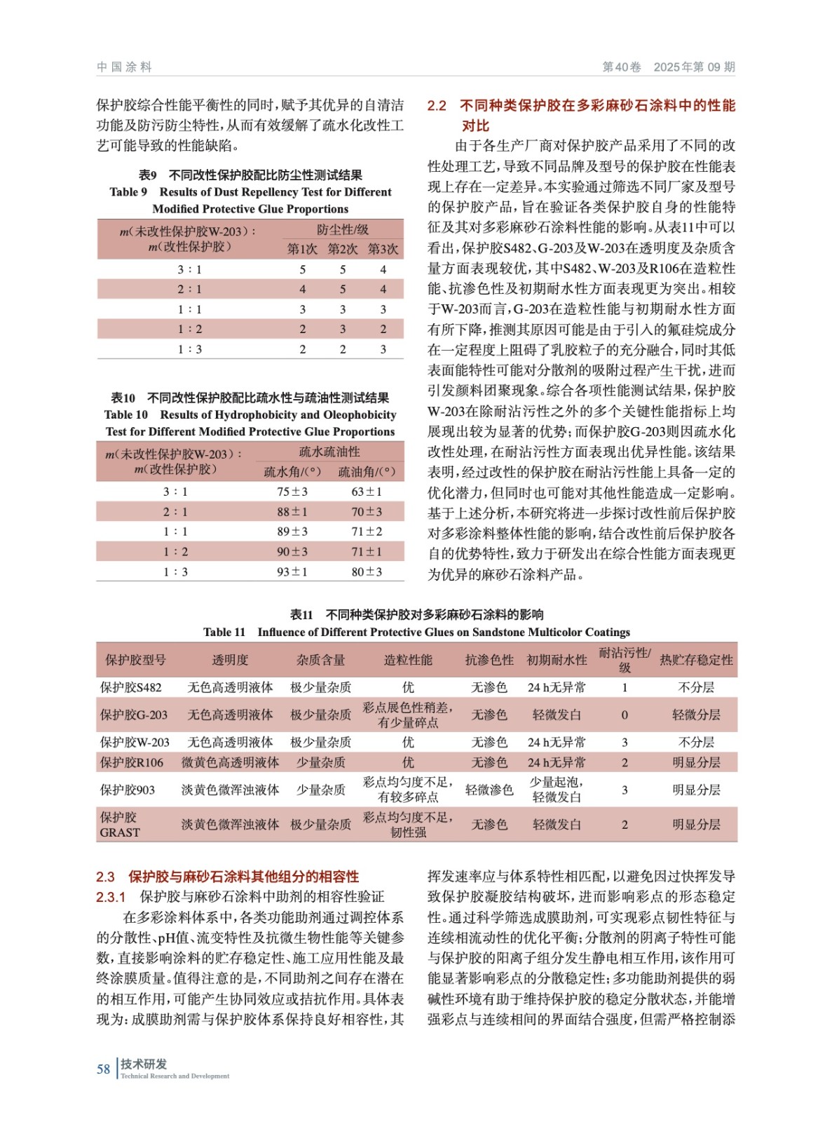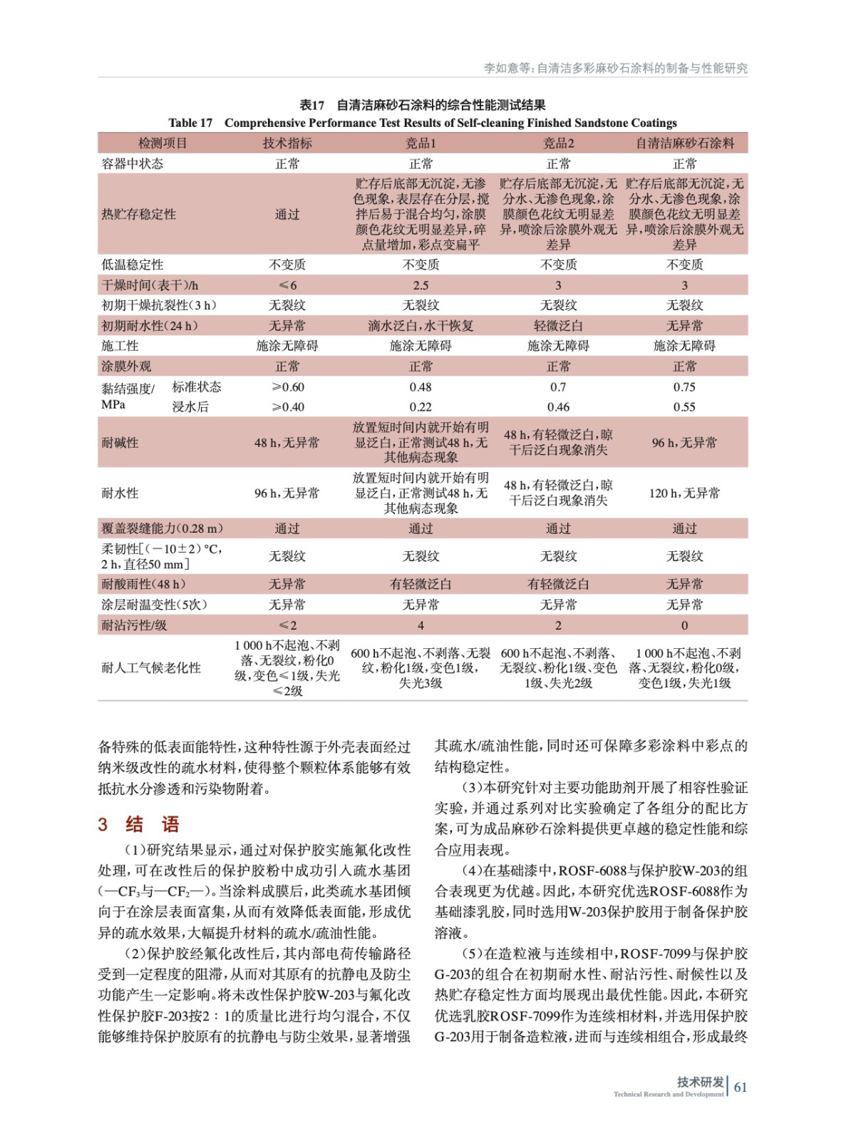 摘要:通過(guò)保護(hù)膠改性、原材料選擇與配方優(yōu)化,系統(tǒng)研究了其對(duì)多彩麻砂石涂料自清潔性能、初期耐水性、耐候性、熱貯存穩(wěn)定性等性能的影響,制備了兼具自清潔功能與優(yōu)異裝飾性能的多彩麻砂石涂料。結(jié)果表明,通過(guò)對(duì)保護(hù)膠的改性處理,可在改性后的保護(hù)膠中引入疏水基團(tuán),有效降低表面能,形成優(yōu)異的疏水效果,但會(huì)對(duì)其原有的抗靜電及防塵功能產(chǎn)生一定影響;將未改性保護(hù)膠與氟化改性保護(hù)膠按質(zhì)量比2∶1均勻混合后,能夠產(chǎn)生協(xié)同作用,在維持保護(hù)膠原有的抗靜電與防塵效果的同時(shí),顯著增強(qiáng)其疏水/疏油性能;在基礎(chǔ)漆中,純丙乳膠ROSF-6088與保護(hù)膠W-203的組合表現(xiàn)更為優(yōu)越,在連續(xù)相與造粒液中,硅丙乳膠ROSF-7099與多功能保護(hù)膠G-203的組合在初期耐水性、耐沾污性、耐候性以及熱貯存穩(wěn)定性方面均展現(xiàn)出最優(yōu)性能。基于以上保護(hù)膠與乳膠組合所開發(fā)的高性能麻砂石涂料,其在自清潔能力、耐沾污性及耐候性等方面表現(xiàn)突出,同時(shí)兼具良好的施工適應(yīng)性與經(jīng)濟(jì)適用性,該研究成果為高性能自清潔外墻涂料的開發(fā)提供了創(chuàng)新性技術(shù)路徑。