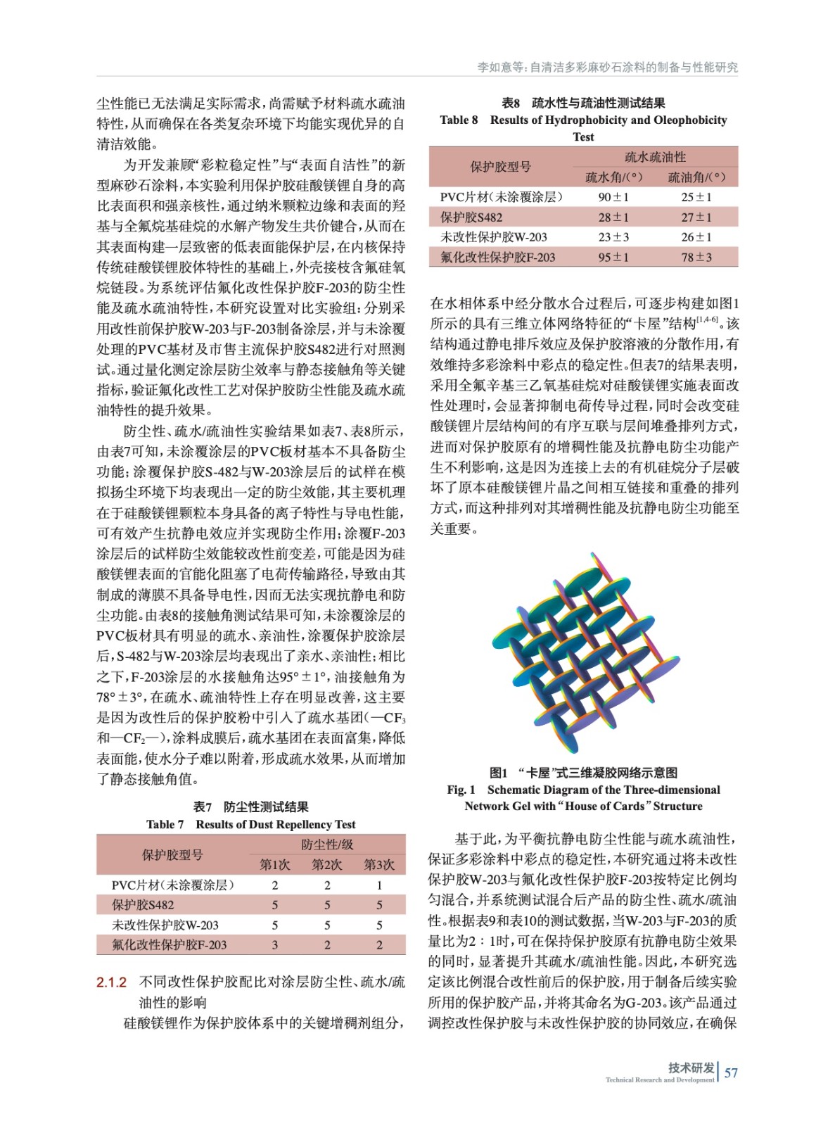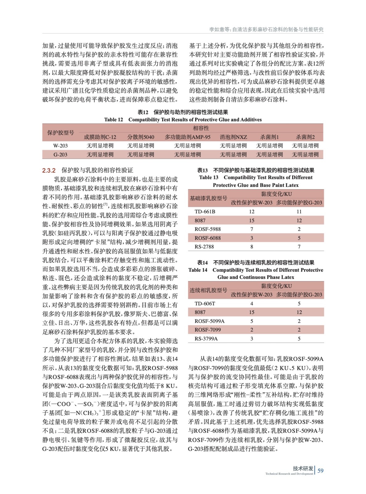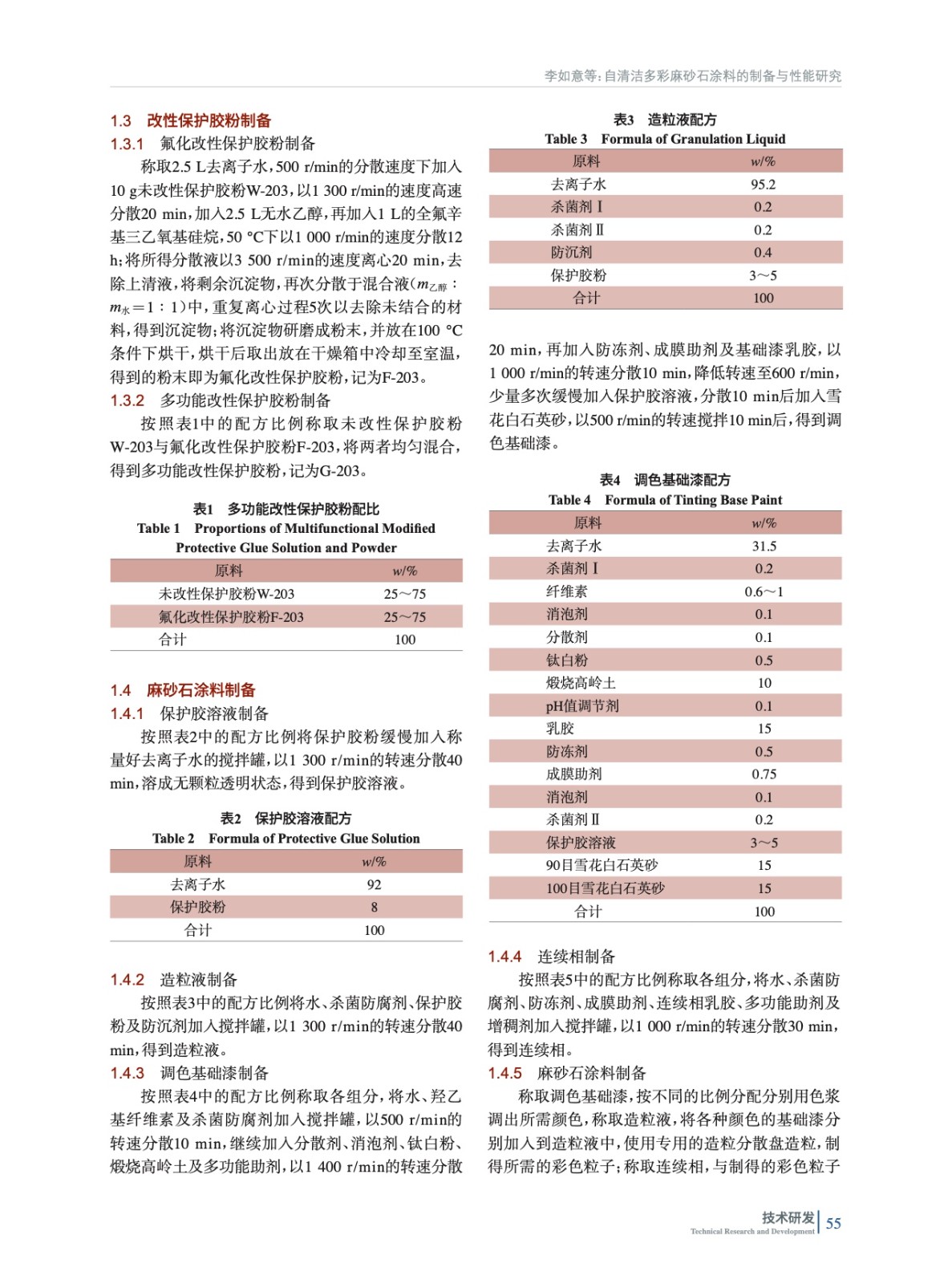 摘要:通過(guò)保護(hù)膠改性、原材料選擇與配方優(yōu)化,系統(tǒng)研究了其對(duì)多彩麻砂石涂料自清潔性能、初期耐水性、耐候性、熱貯存穩(wěn)定性等性能的影響,制備了兼具自清潔功能與優(yōu)異裝飾性能的多彩麻砂石涂料。結(jié)果表明,通過(guò)對(duì)保護(hù)膠的改性處理,可在改性后的保護(hù)膠中引入疏水基團(tuán),有效降低表面能,形成優(yōu)異的疏水效果,但會(huì)對(duì)其原有的抗靜電及防塵功能產(chǎn)生一定影響;將未改性保護(hù)膠與氟化改性保護(hù)膠按質(zhì)量比2∶1均勻混合后,能夠產(chǎn)生協(xié)同作用,在維持保護(hù)膠原有的抗靜電與防塵效果的同時(shí),顯著增強(qiáng)其疏水/疏油性能;在基礎(chǔ)漆中,純丙乳膠ROSF-6088與保護(hù)膠W-203的組合表現(xiàn)更為優(yōu)越,在連續(xù)相與造粒液中,硅丙乳膠ROSF-7099與多功能保護(hù)膠G-203的組合在初期耐水性、耐沾污性、耐候性以及熱貯存穩(wěn)定性方面均展現(xiàn)出最優(yōu)性能。基于以上保護(hù)膠與乳膠組合所開發(fā)的高性能麻砂石涂料,其在自清潔能力、耐沾污性及耐候性等方面表現(xiàn)突出,同時(shí)兼具良好的施工適應(yīng)性與經(jīng)濟(jì)適用性,該研究成果為高性能自清潔外墻涂料的開發(fā)提供了創(chuàng)新性技術(shù)路徑。