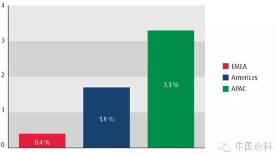 盡管2014-2015年全球涂料產(chǎn)量預(yù)計(jì)增長2.1%,但各地區(qū)市場增長情況明顯不同。預(yù)計(jì)EMEA(0.4%)和美洲地區(qū)(1.8%)的增速會低于全球平均水平,亞太地區(qū)(3.3%)的增速則高于全球平均水平。