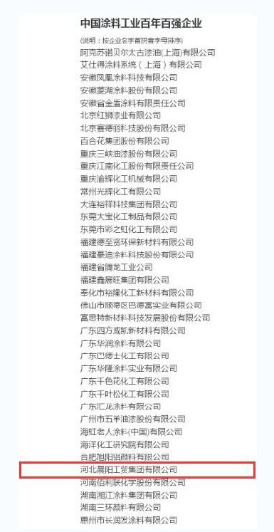 10月10日,由中國涂料工業協會主辦的中國涂料工業百年百強評選活動結果公布,晨陽水漆當選“中國涂料工業百年百強企業”榮譽稱號。