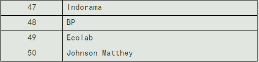 在今年的排行榜中出現了5張新的面孔,包括韓國韓華化學公司、泰國暹羅水泥公司、BP、藝康公司和莊信萬豐公司。BP上榜是因為公司開始及時地公布化工業務的銷售收入,而暹羅水泥和韓華化工則受益于亞洲經濟的增長。藝康公司和莊信萬豐均是專用材料供應商,該行業正在強勁增長。