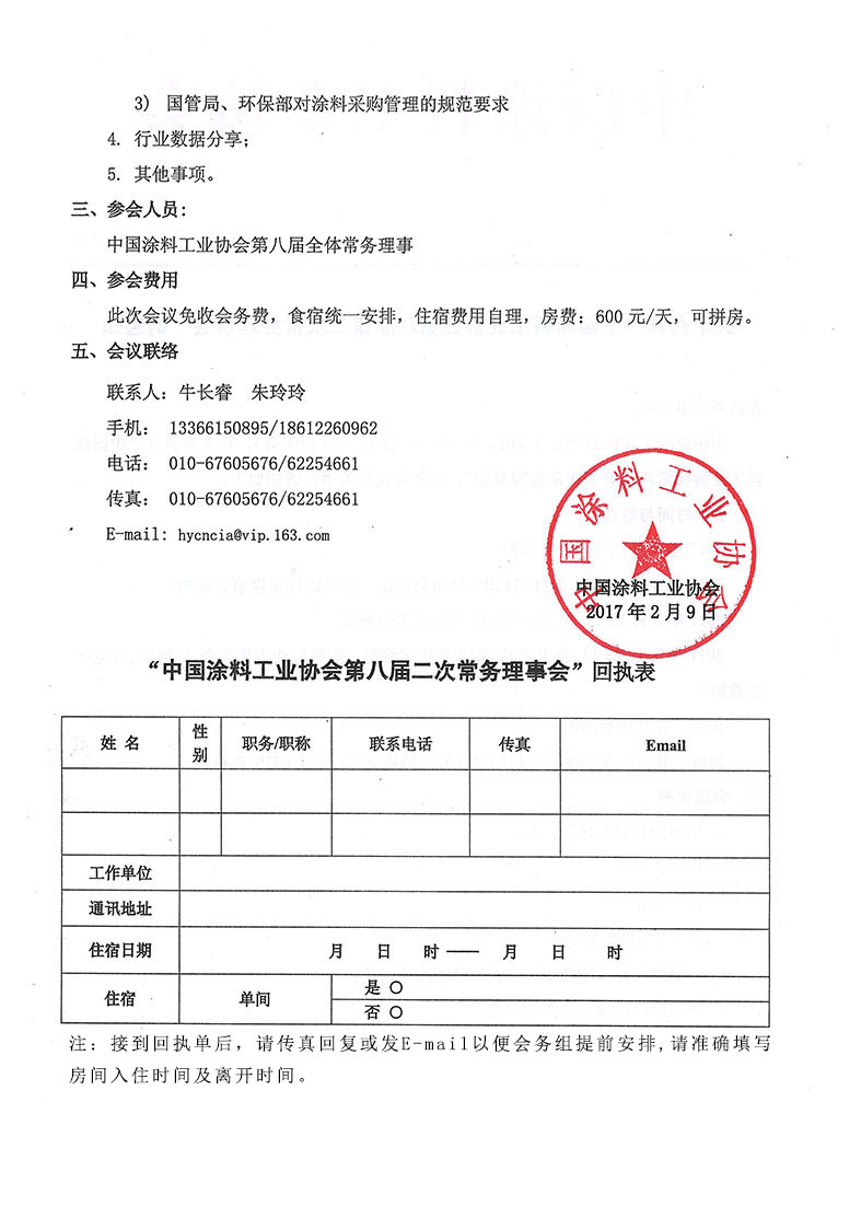 “中國涂料工業(yè)協(xié)會第八屆二次常務理事會”回執(zhí)表