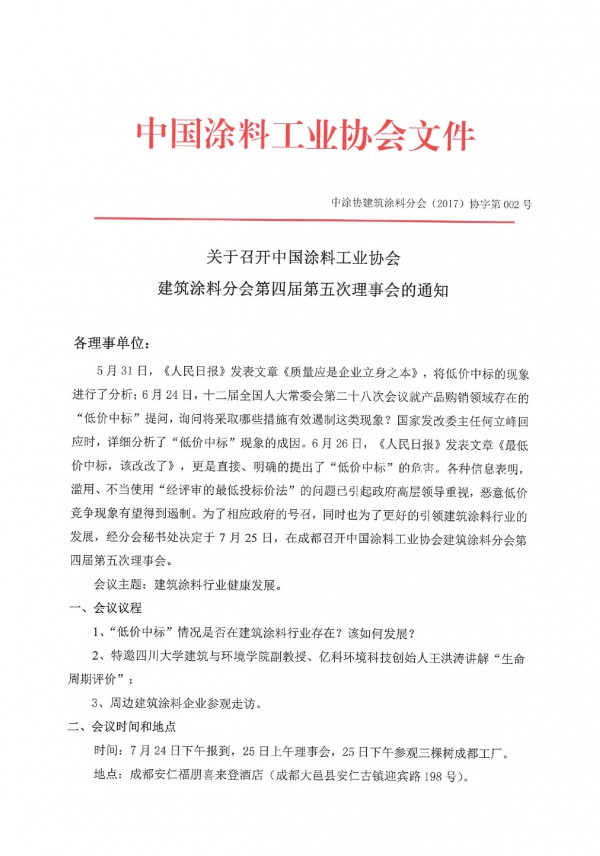 關于召開中國涂料工業協會建筑涂料分會第四屆第五次理事會的通知